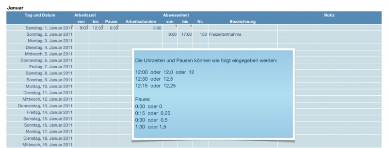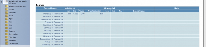 Der Arbeitszeitnachweis ist ein Formular für den täglichen Aufschrieb der persönlichen Arbeits- und Abweseneitszeiten. Pro Tag eine Zeile. Für die Einträge der Abwesenheit gibt es die Möglichkeit, eine der 65 Kennziffern einzutragen, um die Begründung der Abwesenheit zu dokumentieren. Für jeden Monat von Januar bis Dezember 2011 ist eine eigene Tabelle mit Tagesdaten vorbereitet.