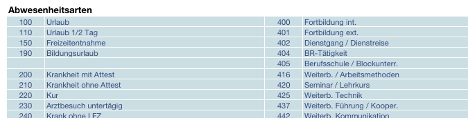 Anhand der 65 Kennziffern werden die entsprechenden Abwesenheitskategorien angezeigt. Die Kategorien sind in einer Tabelle vordefiniert und können angepasst werden.