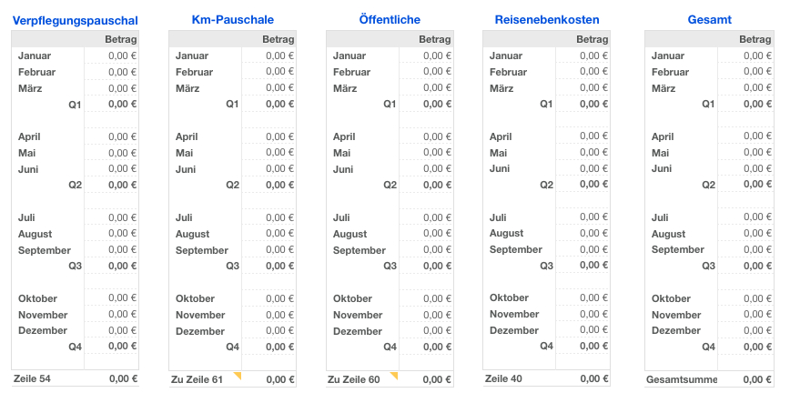 Ihre Einnahmen, Ausgaben, Reisen etc. geben Sie in die Tabellenblätter ein. Die Monats- und Quartalssummen werden automatisch gebildet und zum Jahresende in die Kategorien der Anlage EÜR verrechnet.