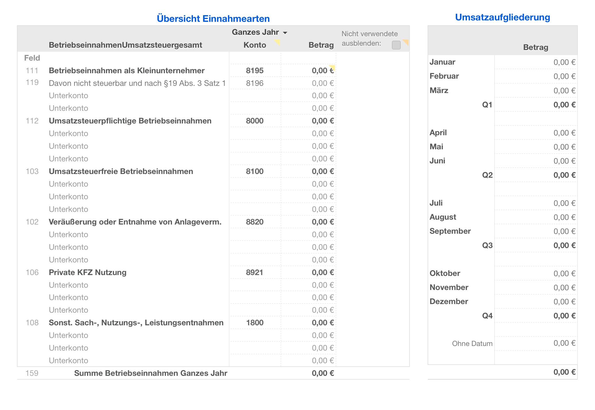 - Konten für Einnahmen und Ausgaben nach dem EÜR-Formular und dem Datev SKR 03