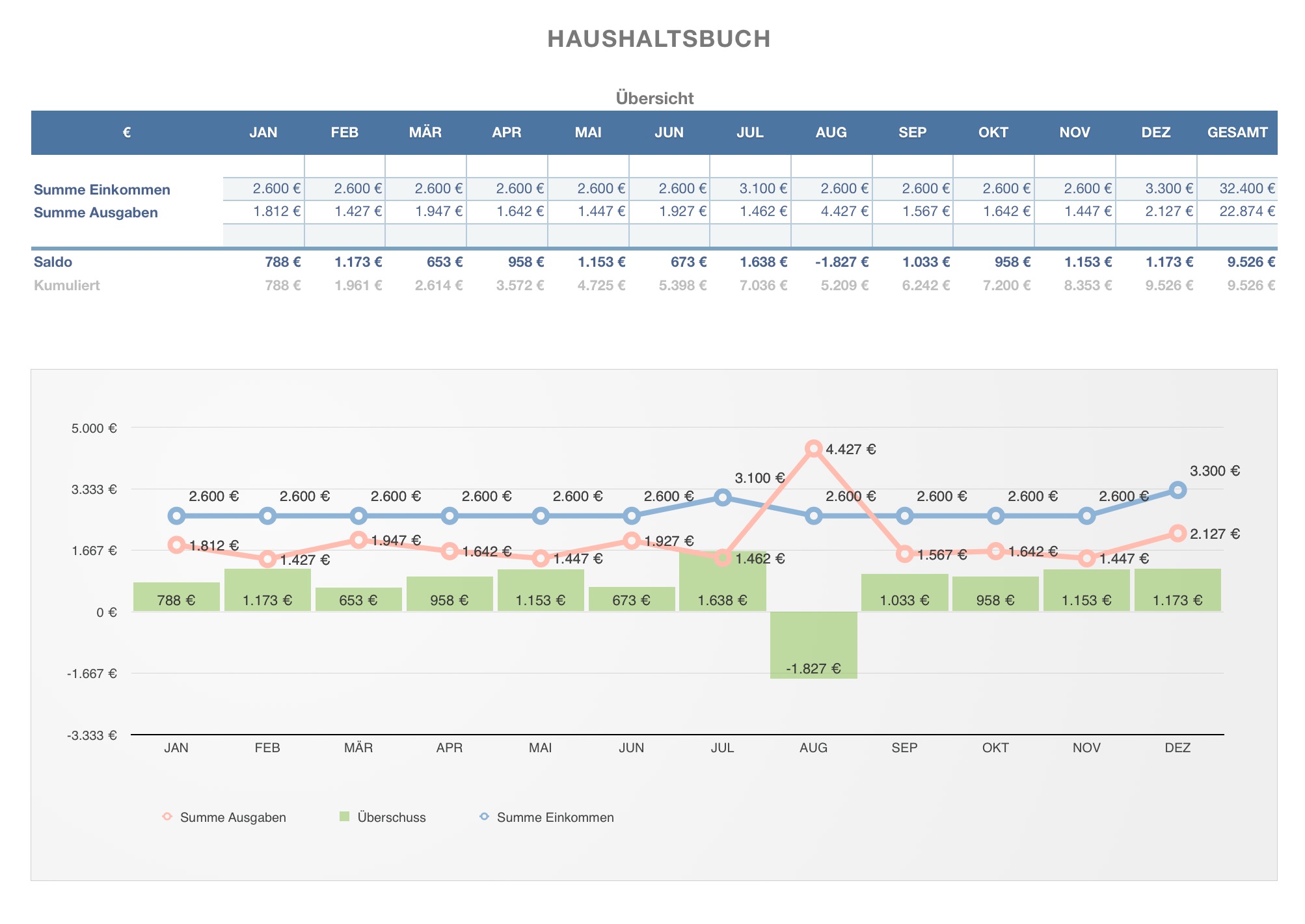 Die Vorlage macht es so besonders einfach, das Budget zu erstellen und die Einkünfte und Ausgaben von Monat zu Monat zu dokumentieren.