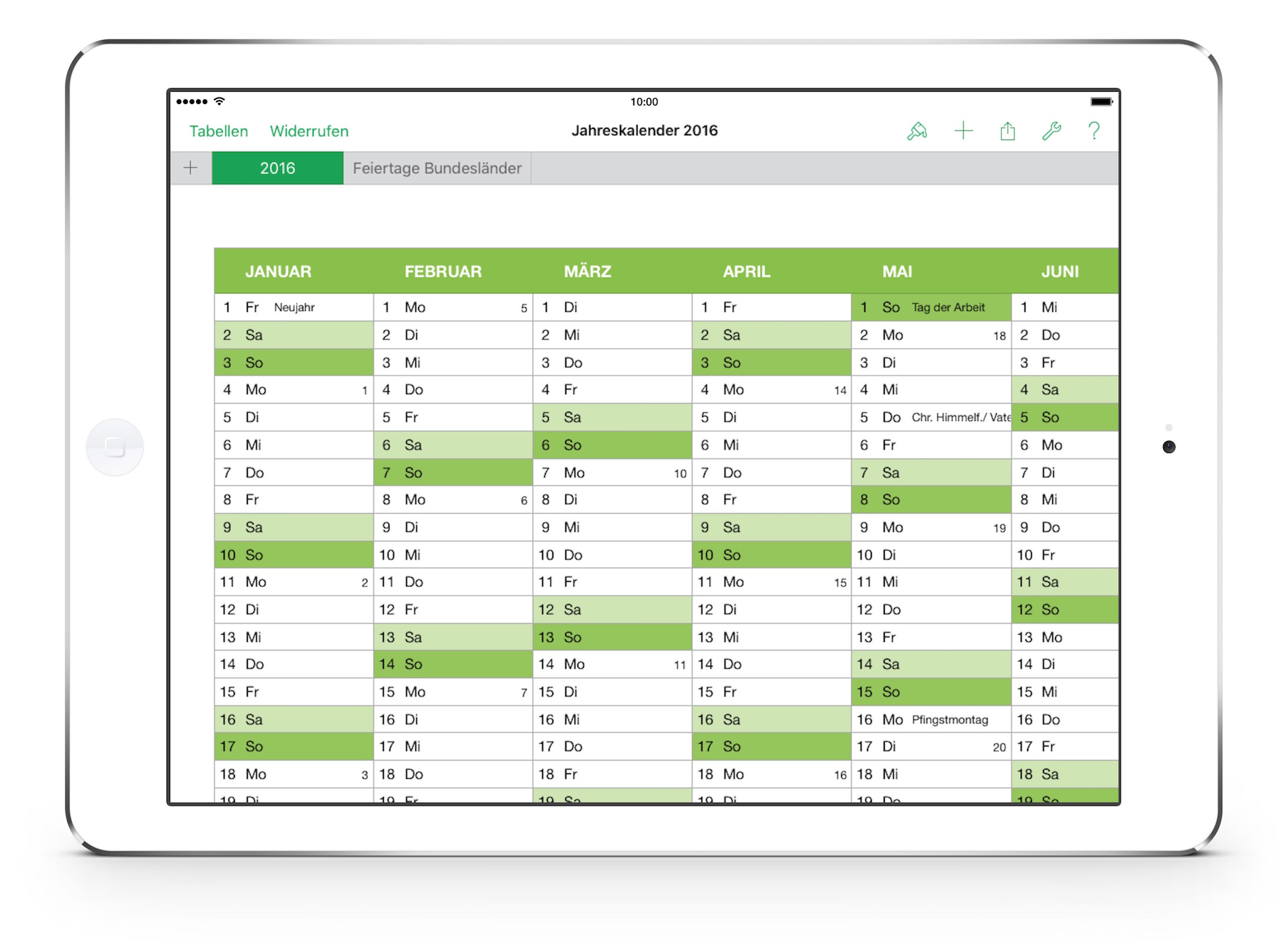 Der Jahreskalender stellt das gesamte Jahr 2016 auf einem Blatt übersichtlich dar. Er lässt sich ausdrucken oder am Bildschirm nutzen und bearbeiten.
