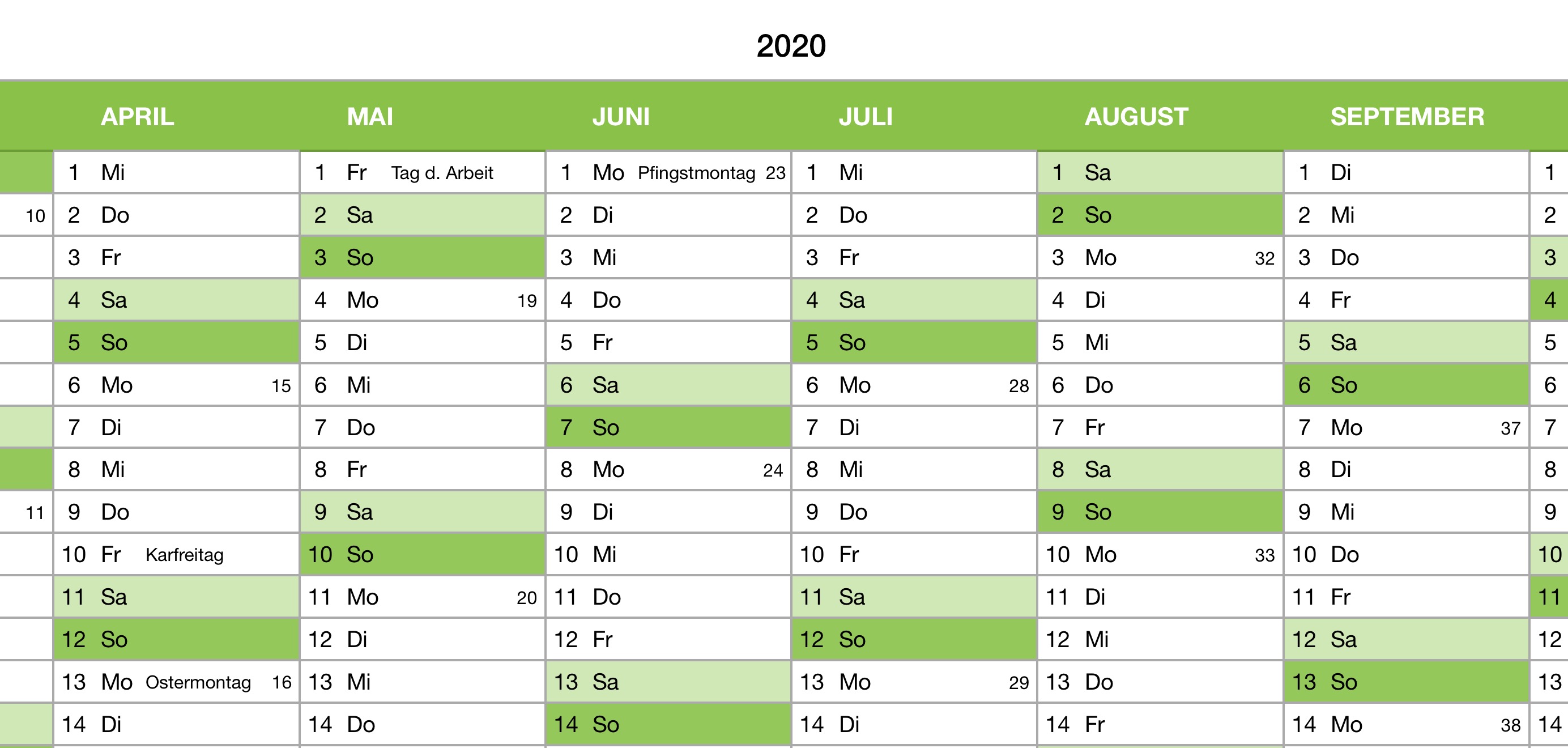 Der Jahreskalender stellt das gesamte Jahr 2020 auf einem Blatt übersichtlich dar. Er lässt sich ausdrucken oder am Bildschirm nutzen und bearbeiten.