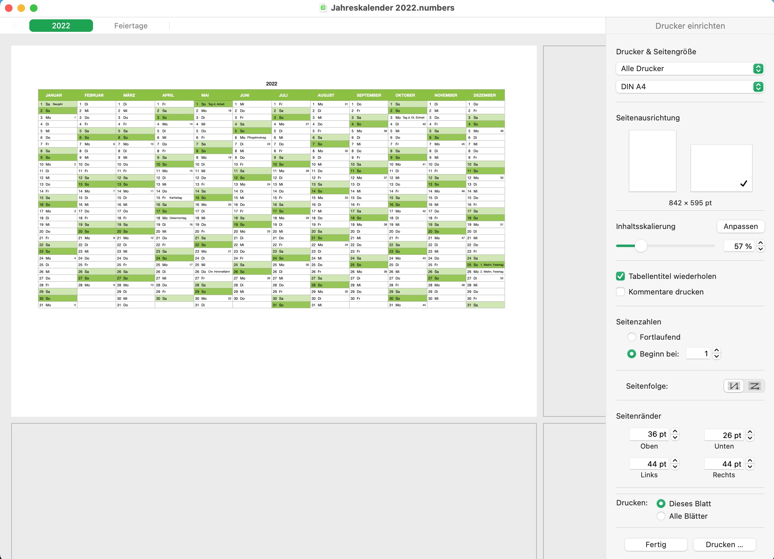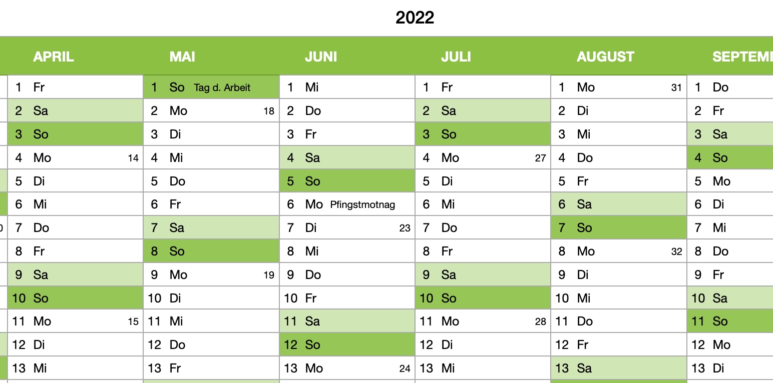 Der Jahreskalender stellt das gesamte Jahr 2022 auf einem Blatt übersichtlich dar. Er lässt sich ausdrucken oder am Bildschirm nutzen und bearbeiten.