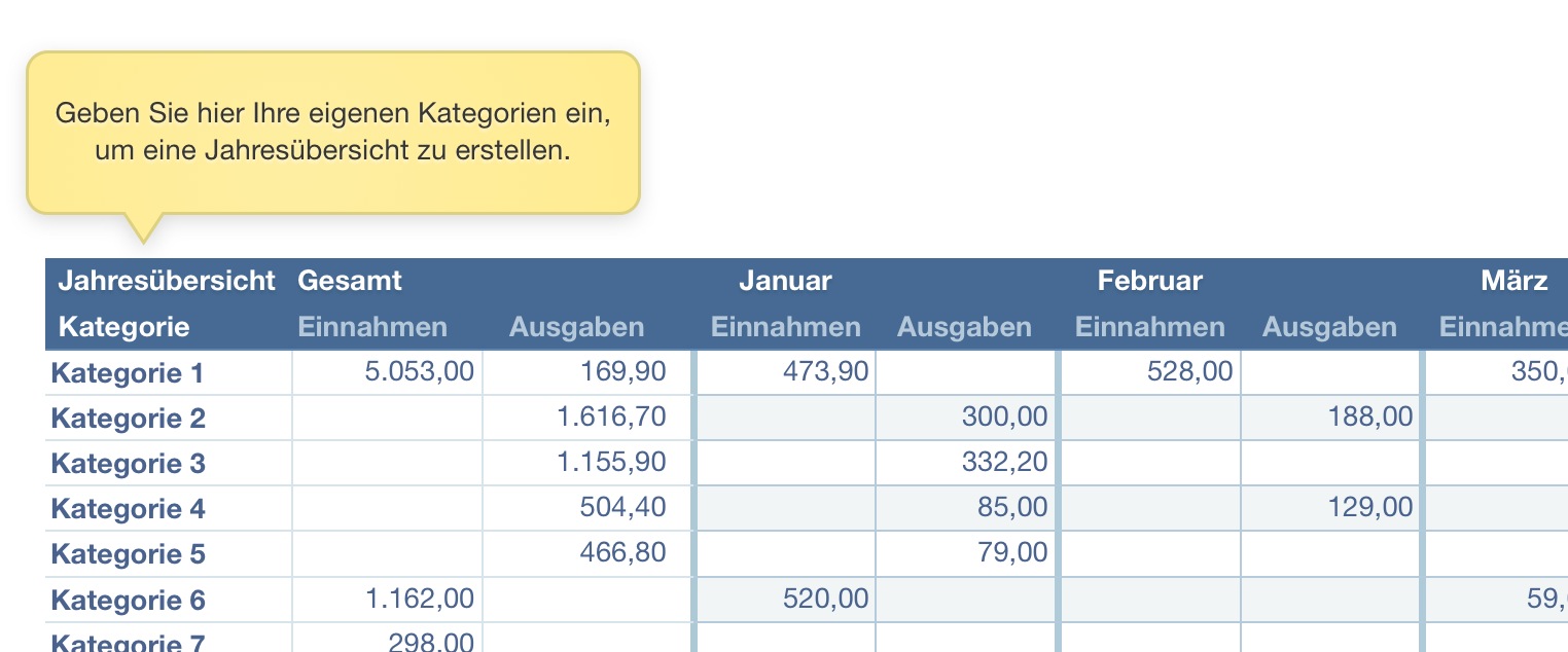 Es steht ebenfalls eine detailliertere Auswertung nach Kategorien und Monaten zur Verfügung. Kategorien können verwendet werden, um eine bessere Übersicht zu erhalten. In der Auswertung stehen dafür 15 Zeilen für je eine Kategorie zur Verfügung. Es können weitere hinzugefügt werden. Tragen Sie hier die Kategorien ein, die Sie bei der Erfassung verwenden. Diese werden dann nach ihren monatlichen Summen dargestellt.
