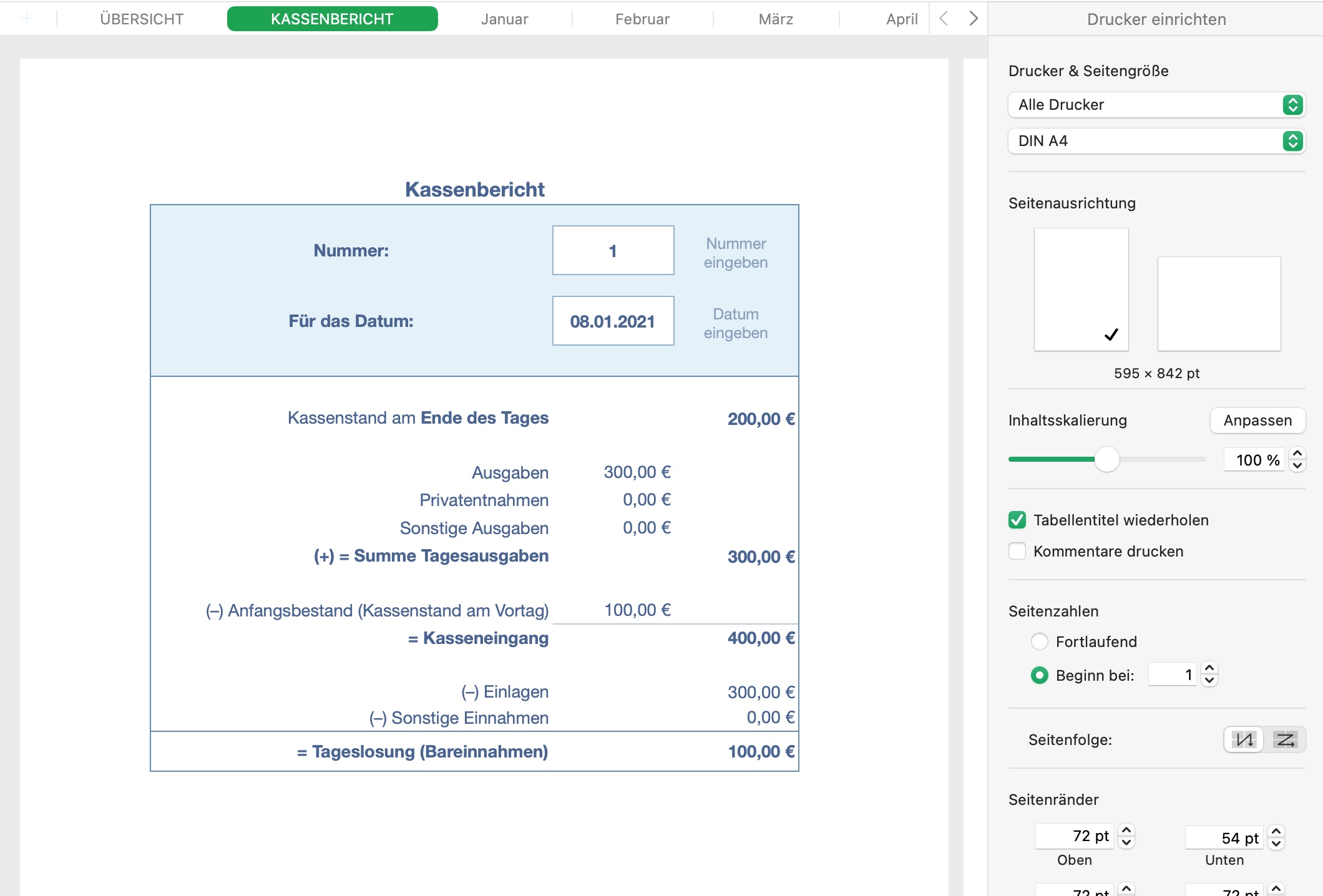 • Tagesliste mit jeweiligen Anfangs- und Endstand der Kasse pro Tag für einen gesamten Monat