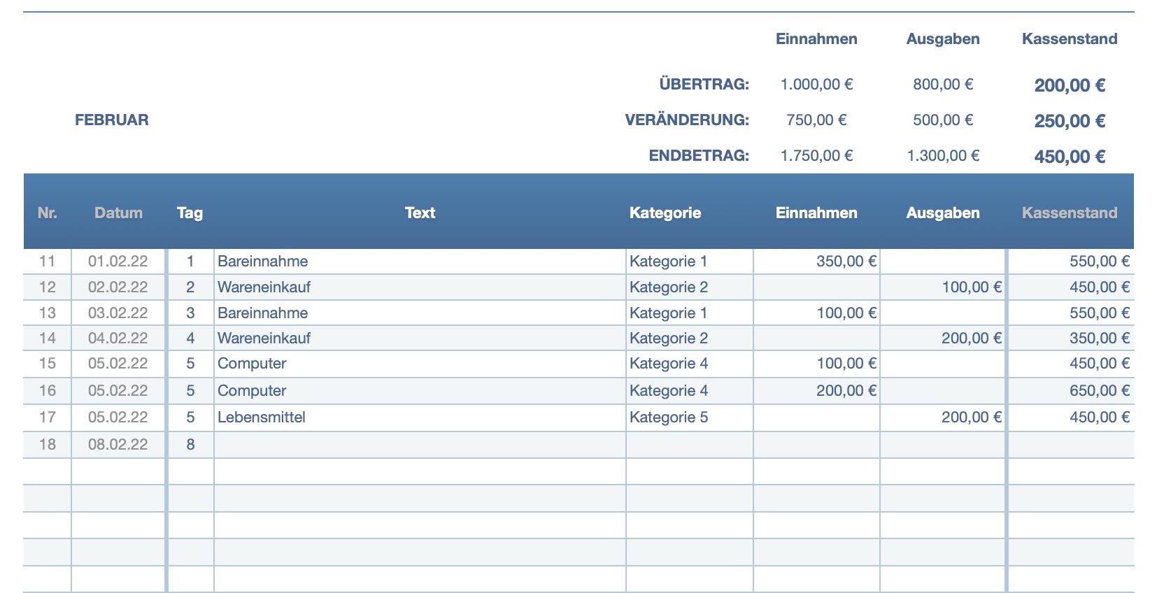 Jeder Monat zeigt übersichtlich die Summe der Einnahmen, Ausgaben und den Kassenbestand zeilengenau an. Die Salden und Zeilennummern werden in den nächsten Monat übertragen.