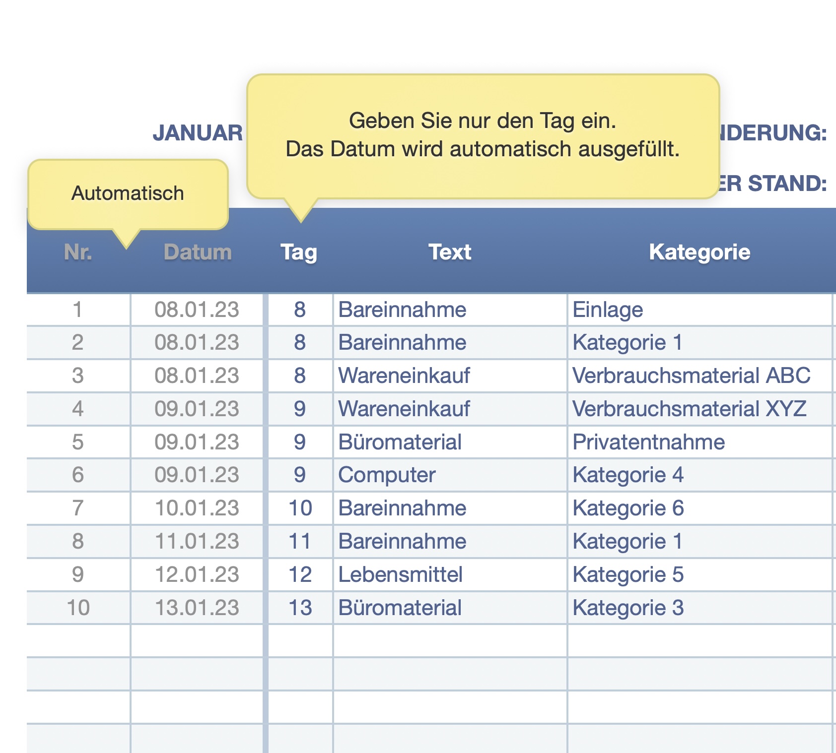 Die Kassenbuch-Vorlage zur Erfassung der Einnahmen und Ausgaben inklusive oder ohne Umsatzsteuer für das Jahr 2023. Für jeden Monat gibt es eine Tabelle mit 150 Zeilen, zu denen weitere hinzugefügt werden können. Jede Zeile erfasst eine Einnahme oder Ausgabe mit diesen Angaben: