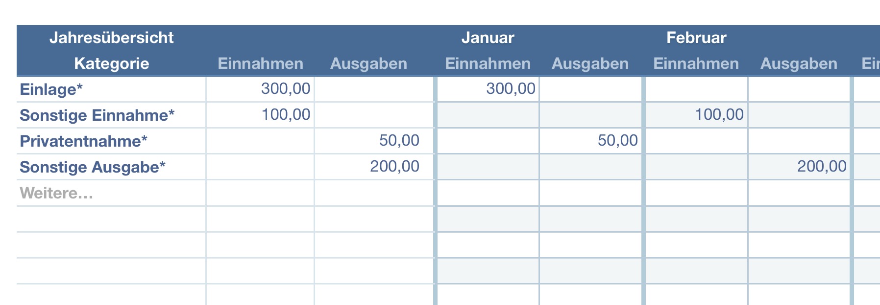 Es steht ebenfalls eine detailliertere Auswertung nach Kategorien und Monaten zur Verfügung. Kategorien können verwendet werden, um eine bessere Übersicht zu erhalten. In der Auswertung stehen dafür bereits 15 Zeilen für je eine Kategorie zur Verfügung. Tragen Sie dort die Kategorien ein, die Sie bei der Erfassung verwenden, um deren Summen zu sehen. Es können weitere hinzugefügt werden.