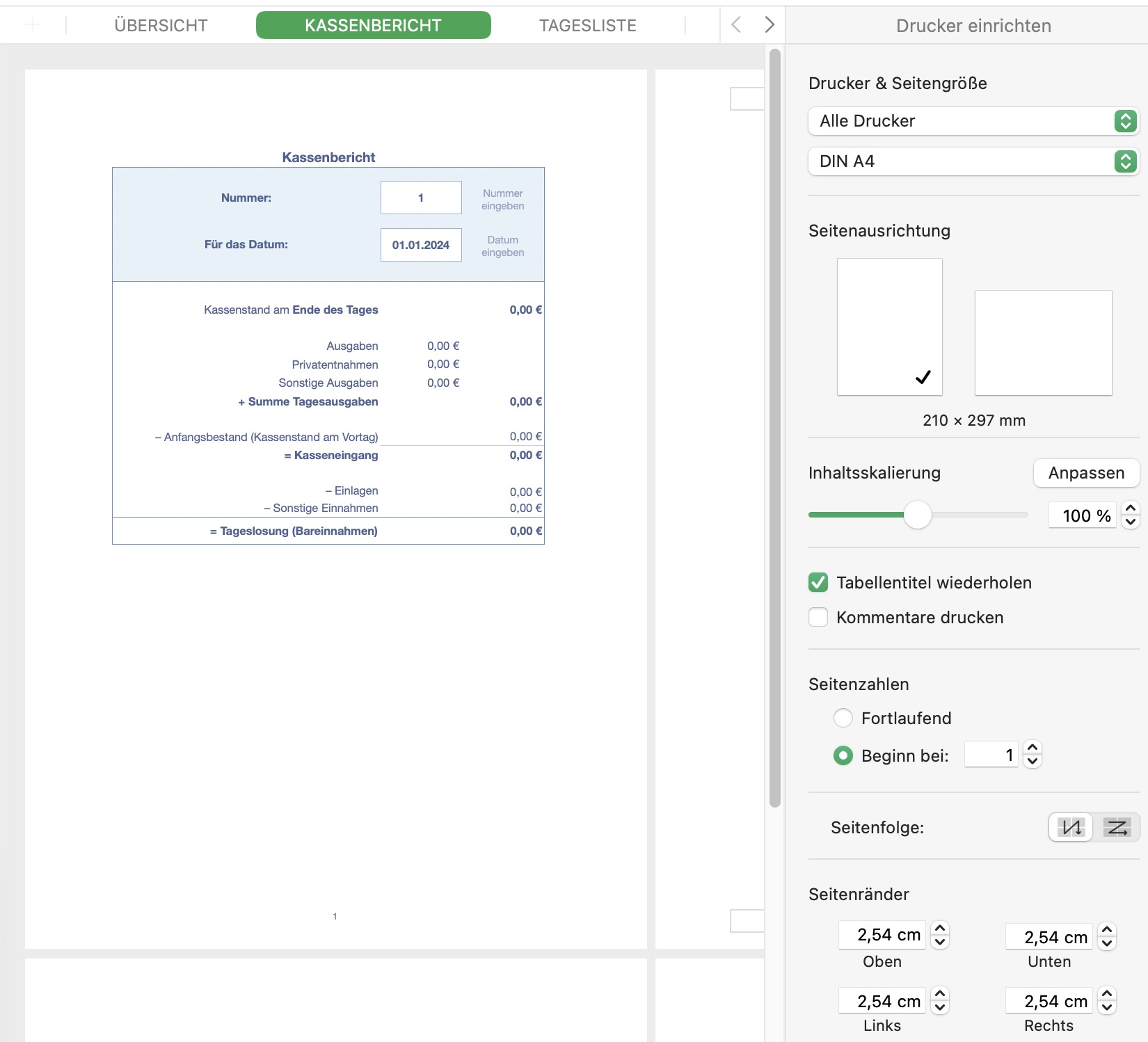 - Voreingestellte Druckansicht, die Kopfzeile wiederholt sich auf jeder Seite