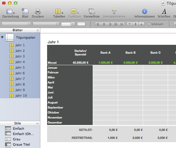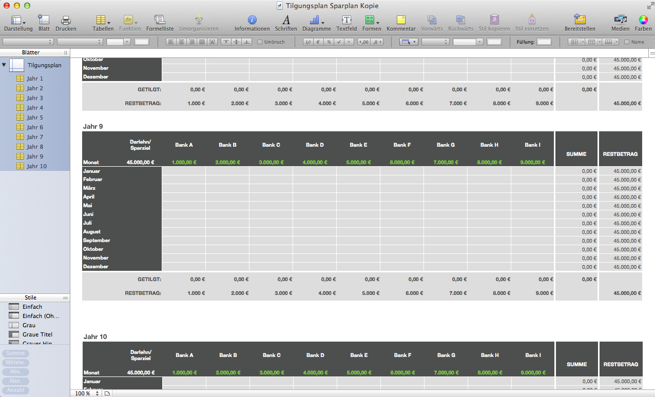Einfach zu bedienende Vorlage zur Tilgung (oder Ansparung) einer bestimmten Summe über insgesamt 9 Konten. Der Plan geht über 10 Jahre (Jan. bis Dez.). Die Zwischensummen am Jahresende werden automatisch auf das neue Jahr übertragen.