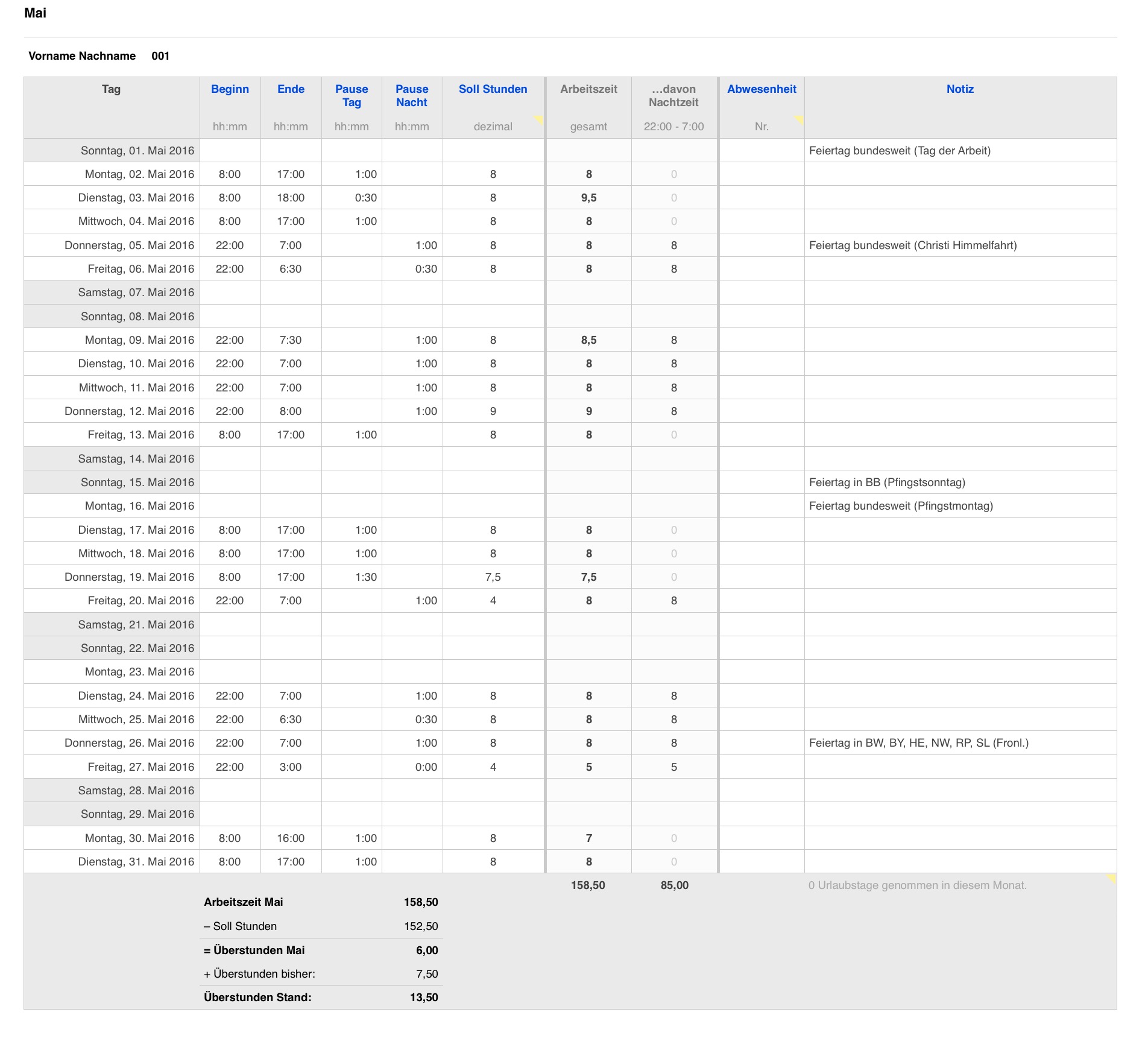 Pro Tag ist eine Zeile vorgesehen. Jeder Monat ist auf einem eigenen Blatt mit übersichtlichen Summen, der Überstundenberechnung, Nachtstundenberechnung und voreingestellter Druckansicht.