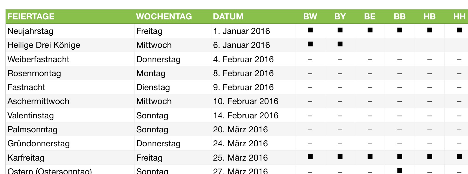 Feiertage sind mit Hinweis auf die betreffende Bundesländer (D) eingetragen und zusätzlich in einer eigenen Übersicht aufgelistet.