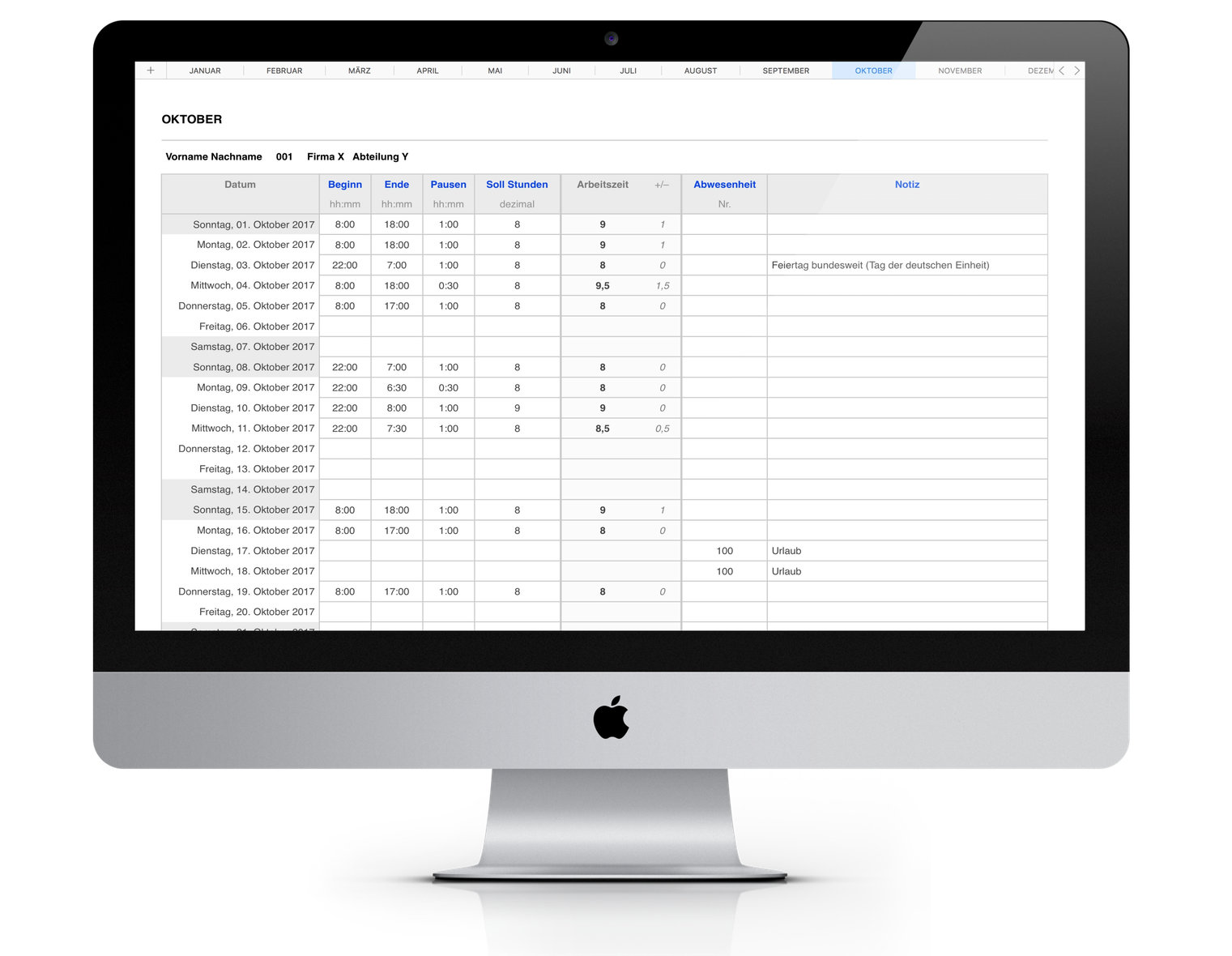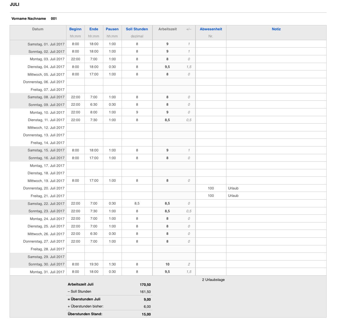 Pro Tag ist eine Zeile vorgegeben. Jeder Monat ist auf einem eigenen Blatt mit übersichtlichen Summen der Arbeitszeit, Überstunden und genommenen Urlaubstagen.