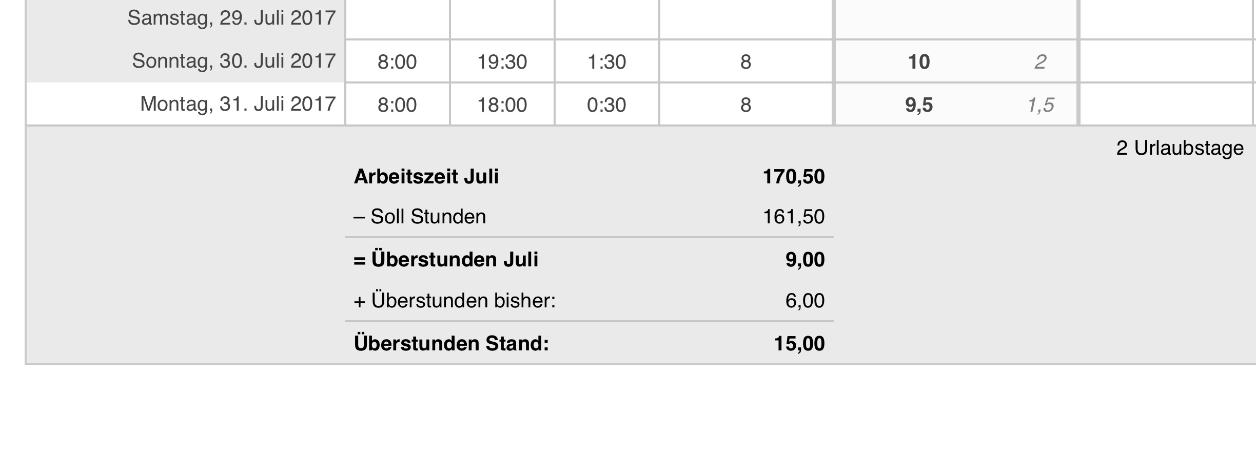 Die tägliche Arbeitszeit wird aus den Einträgen errechnet und die aktuellen Überstunden im Monat sowie die insgesamt aufgelaufenen Überstunden angezeigt.