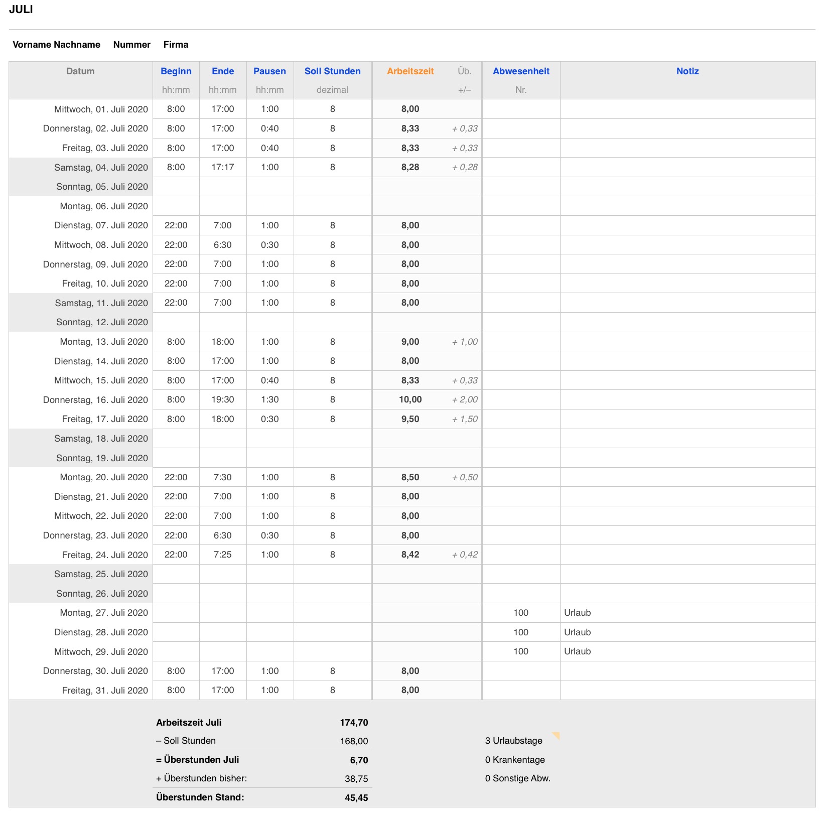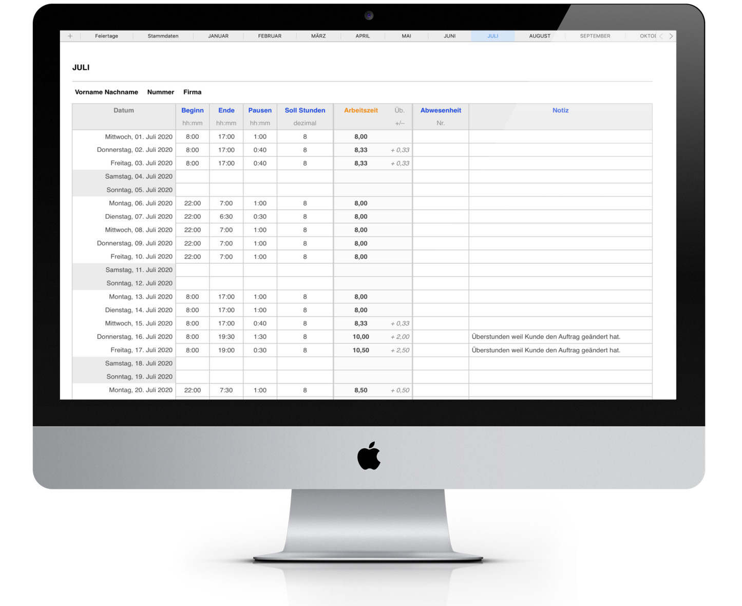 Pro Tag ist eine Zeile mit Datum vorgegeben. Jeder Monat ist auf einem eigenen Blatt mit übersichtlicher Summe der Arbeitszeit, Überstunden und Urlaubstage.