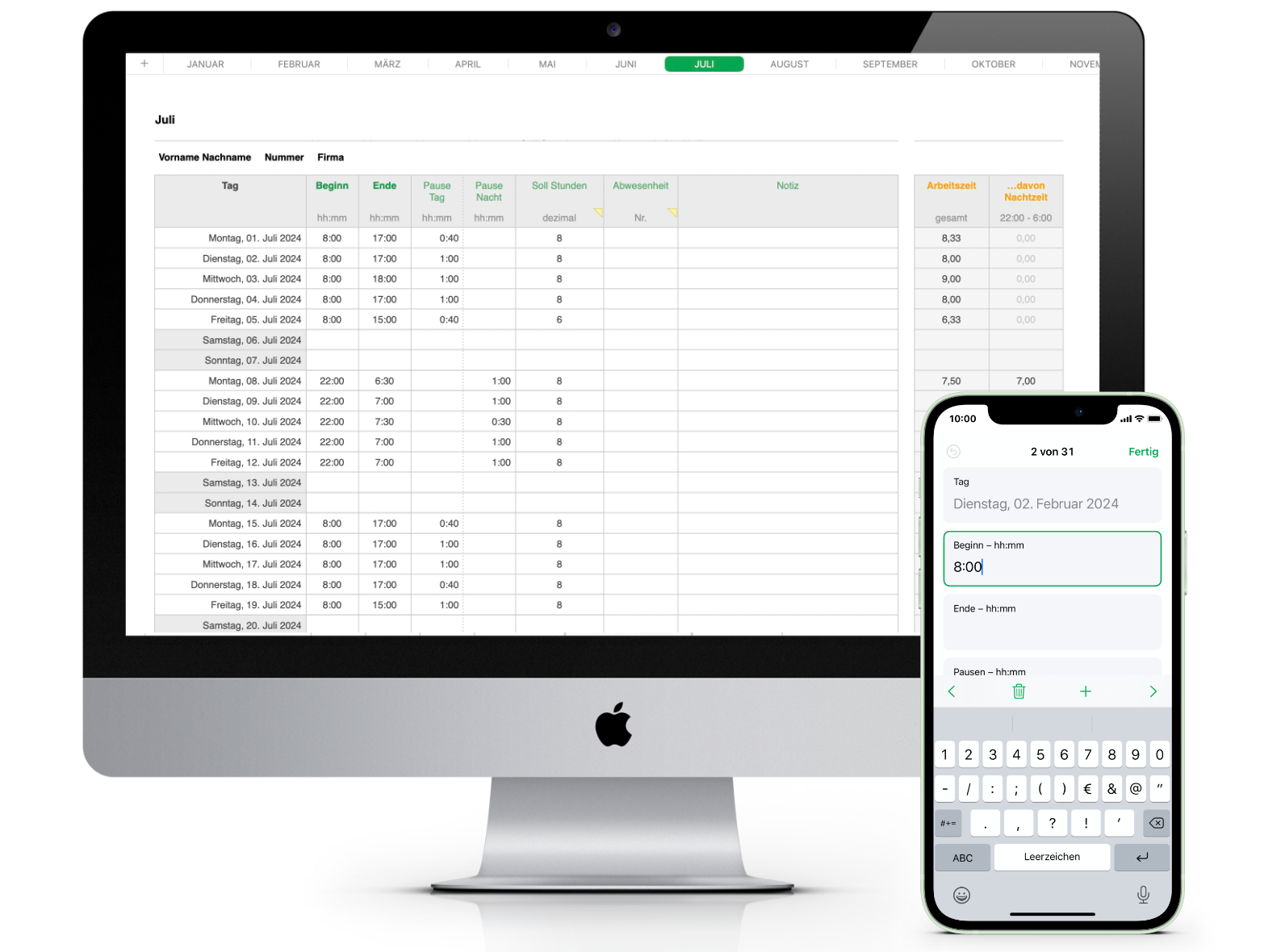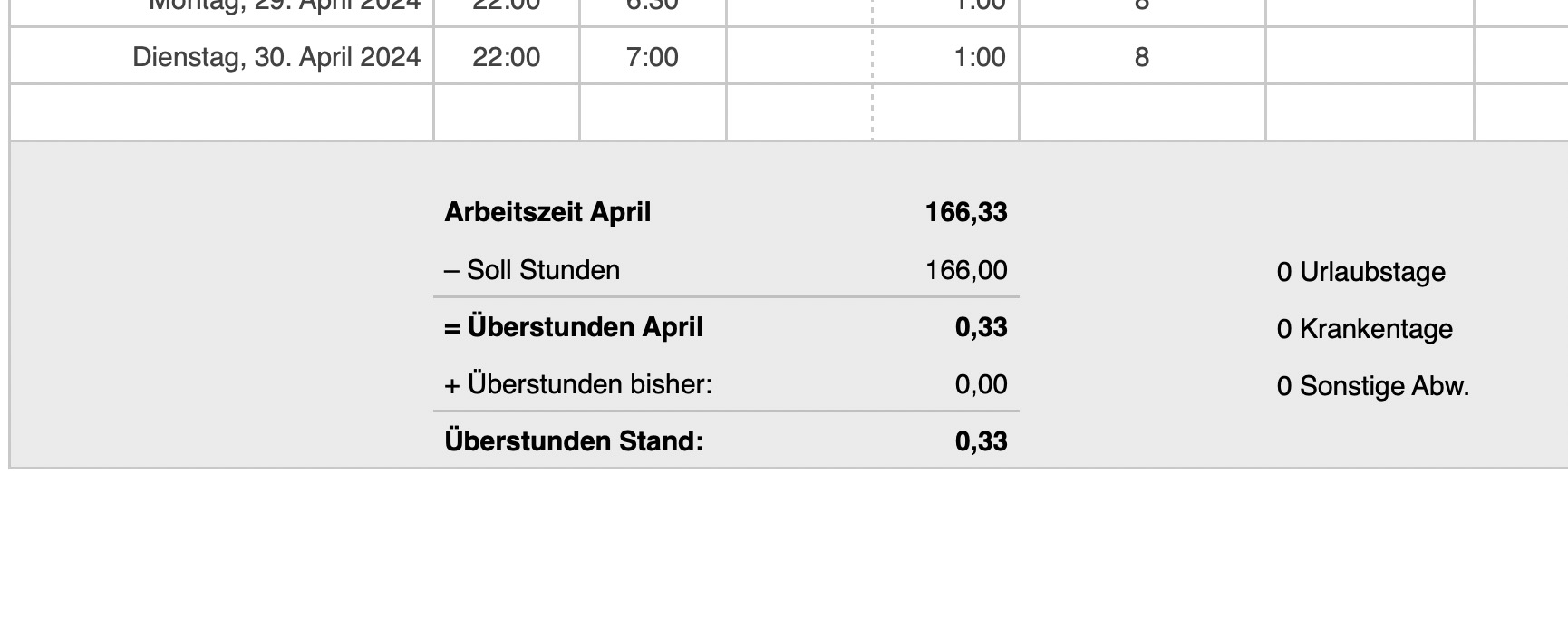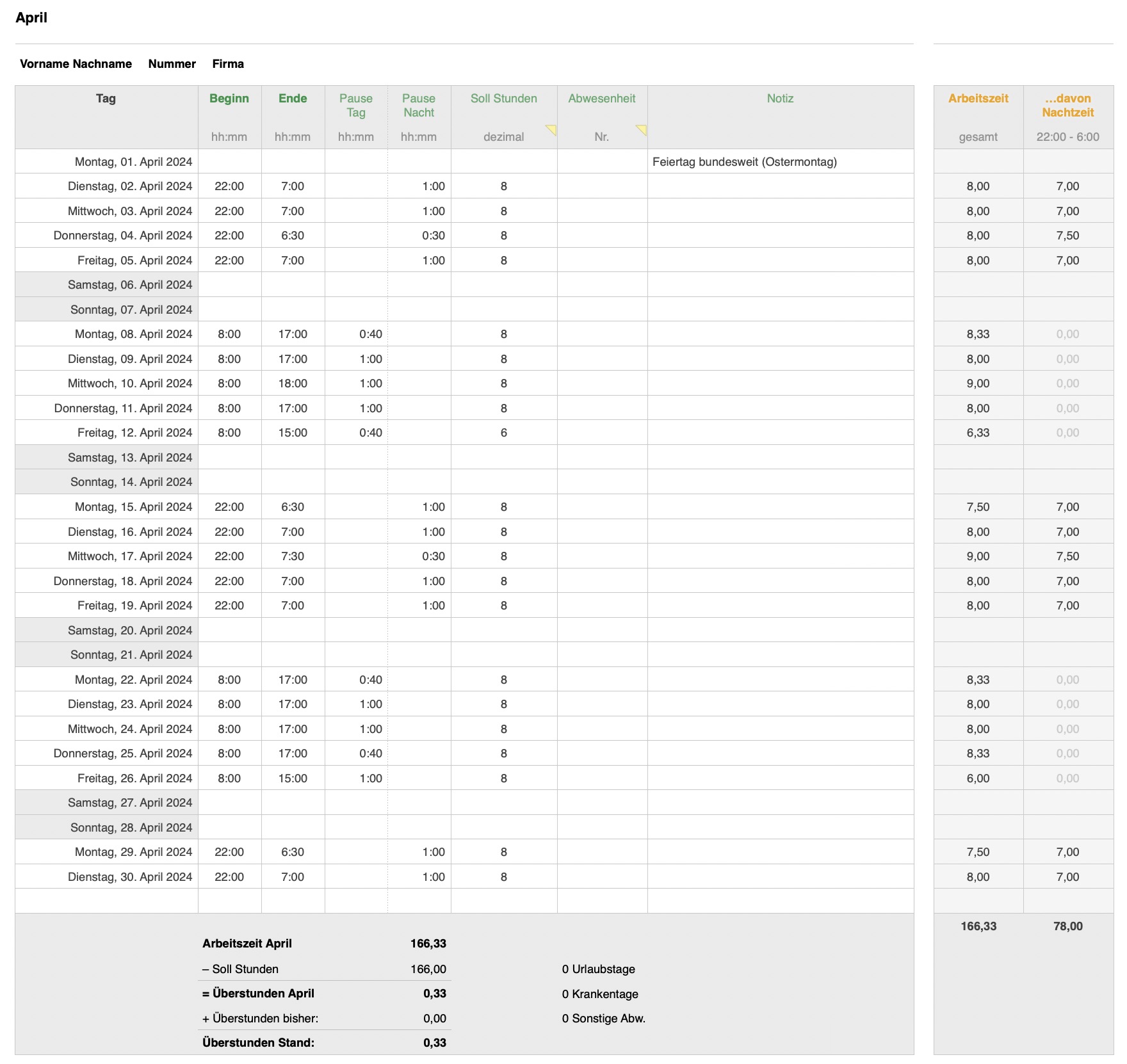 Die tägliche Arbeitszeit wird mit der anteiligen Nacht-Zeit errechnet. Die Überstunden im aktuellen Monat sowie die im Jahr aufgelaufenen Überstunden sind auf jedem Blatt für den jeweiligen Monat dargestellt.