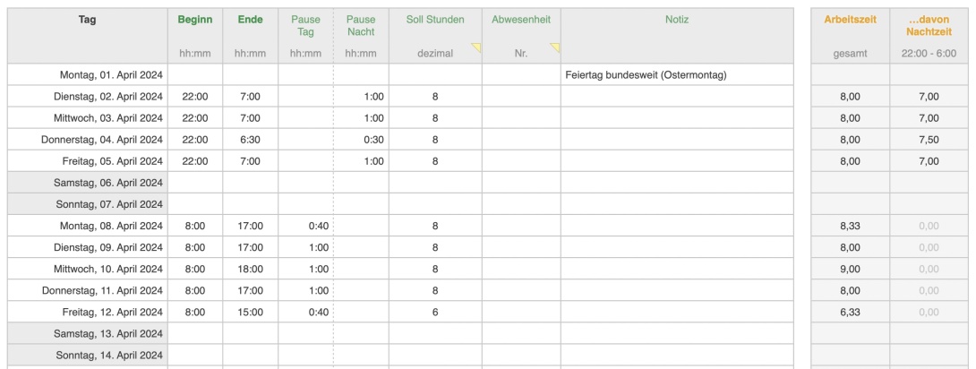 • Arbeitszeit (Beginn, Ende, Pausendauer Tag, Pausendauer Nacht)