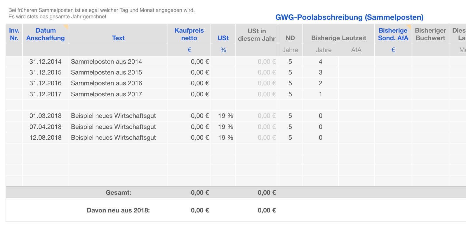 Optional kann ein GWG auch so abgeschrieben werden, wie ein Wirtschaftsgut mit höheren Anschaffungskosten (also die nicht-GWG). In dem Fall tragen Sie das betreffende WG in der entsprechenden Tabelle mit seiner korrekten Nutzungsdauer ein (z.B. Bewegliche Wirtschaftsgüter) ein. Welche Methode für Ihre WG in Ihrem Fall die richtige ist, erfragen Sie am besten bei einem Steuerberater oder Fachkundigen Stelle, da ich keine Steuerberagung gebe.