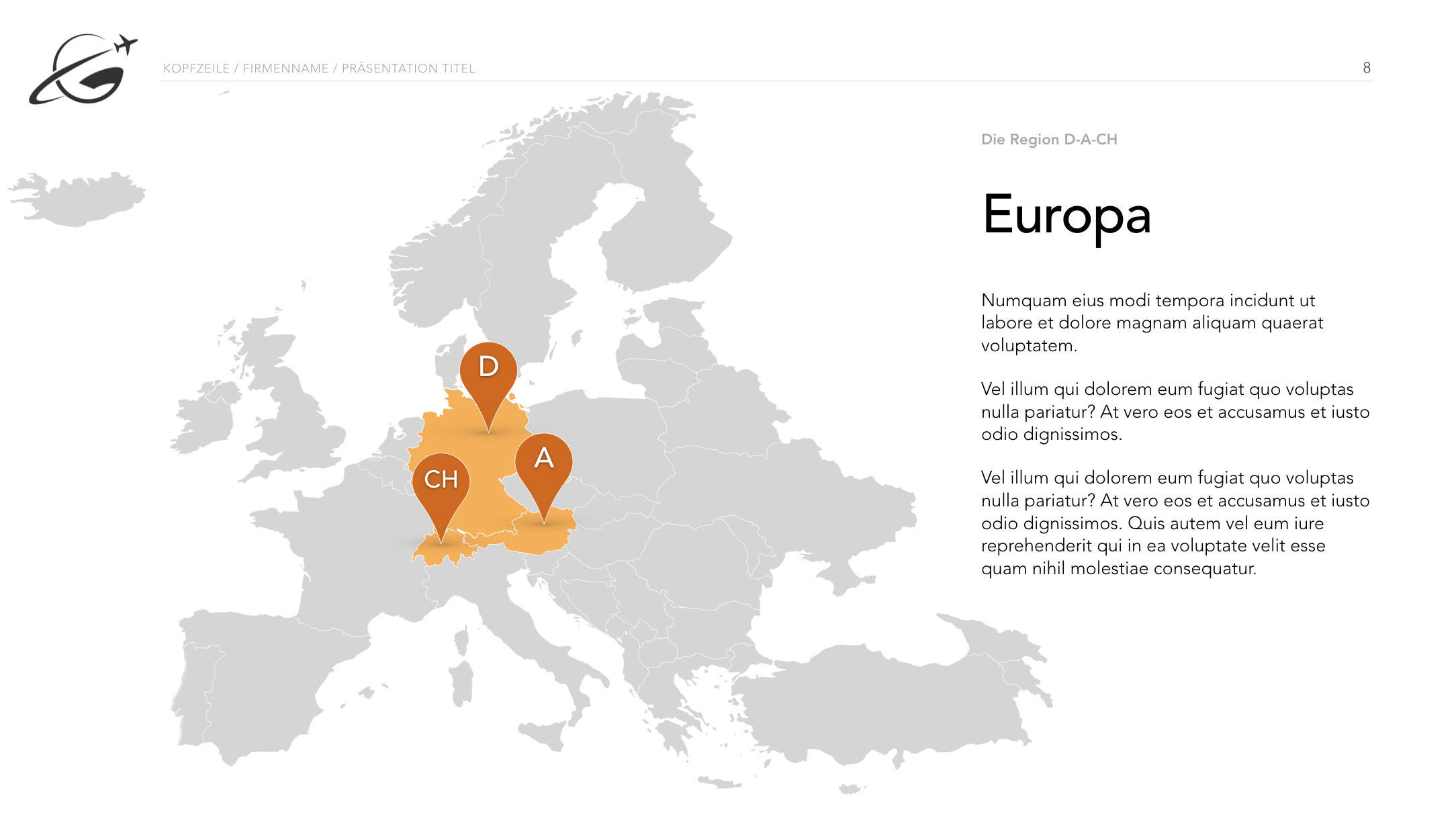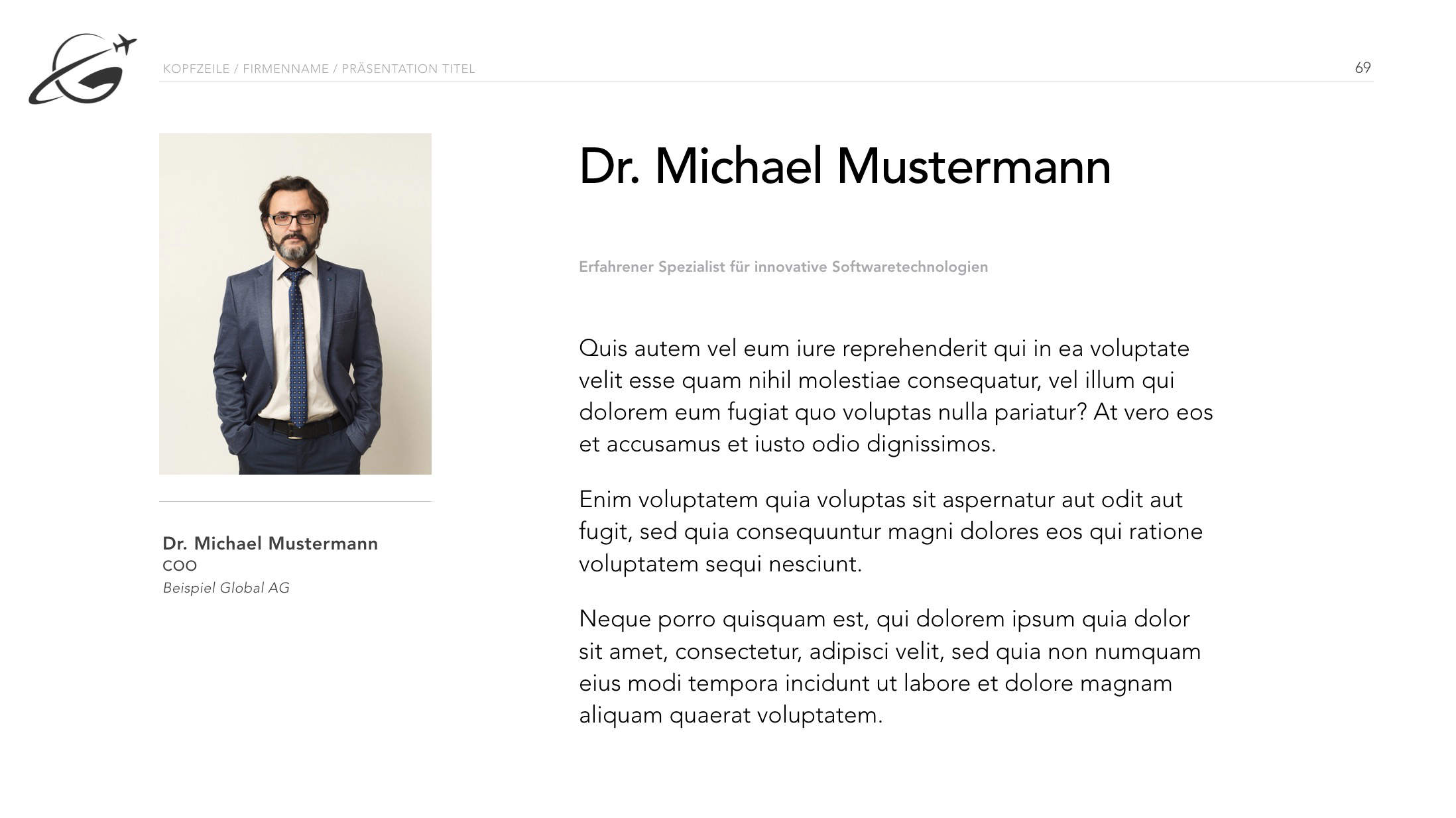 Diese Vorlage eignet sich für alle Präsentationen mit gängigen oder allgemeinen Themen. Die über 70 Vorlagenfolien enthalten jeweils Platzhalter für das Ihr Firmenlogo, eine Kopfzeile und die Foliennummer als Basis. Darauf aufbauend enthalten die Folien unterschiedliche Kofigurationen von Text- und Medienplatzhaltern. Alle Texte, Formen und Tabellen sind mit Stilen versehen sodass sie mit wenigen Klicks in der gesamten Präsentation geändert werden können.