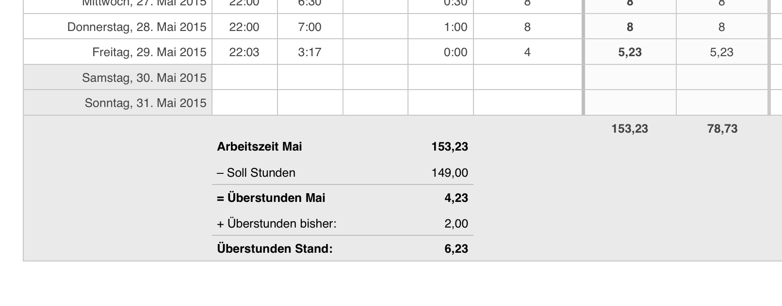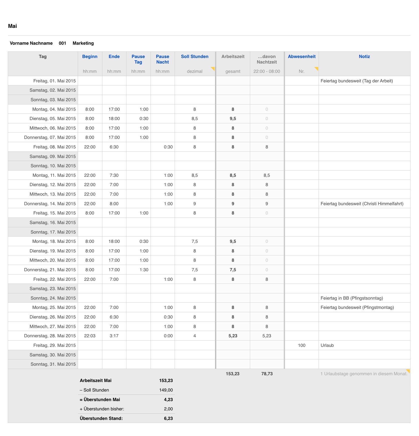 Die tägliche Arbeitszeit wird mit ihrer anteiligen Nacht-Zeit errechnet. Die aktuellen Überstunden im aktuellen Monat sowie die insgesamt aufgelaufenen Überstunden sind auf jedem Blatt übersichtlich dargestellt.