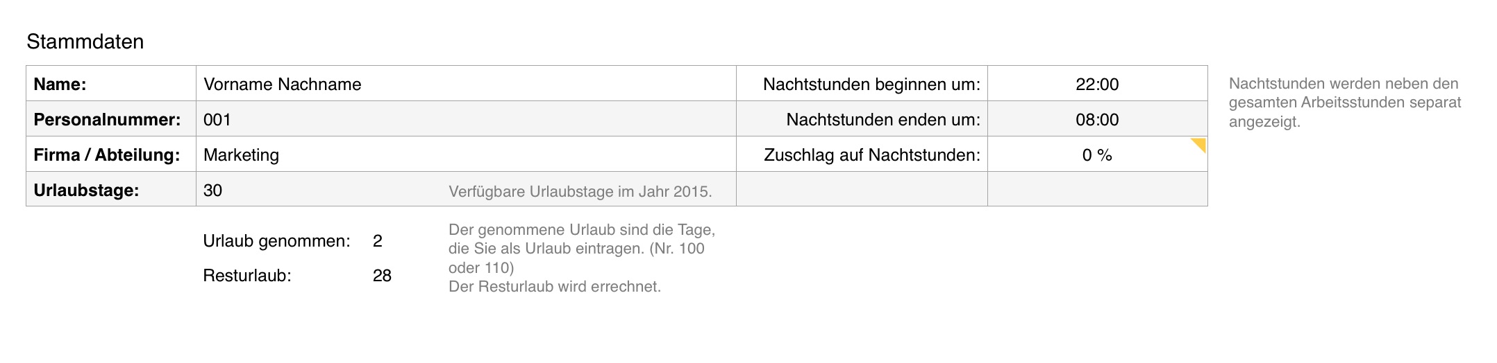Für Stammdaten (z.B. Name, Personalnummer, Abteilung) gibt es 3 frei belegbare Felder, die im ersten Blatt eingetragen werden und auf den Monatsblättern automatisch erscheinen.