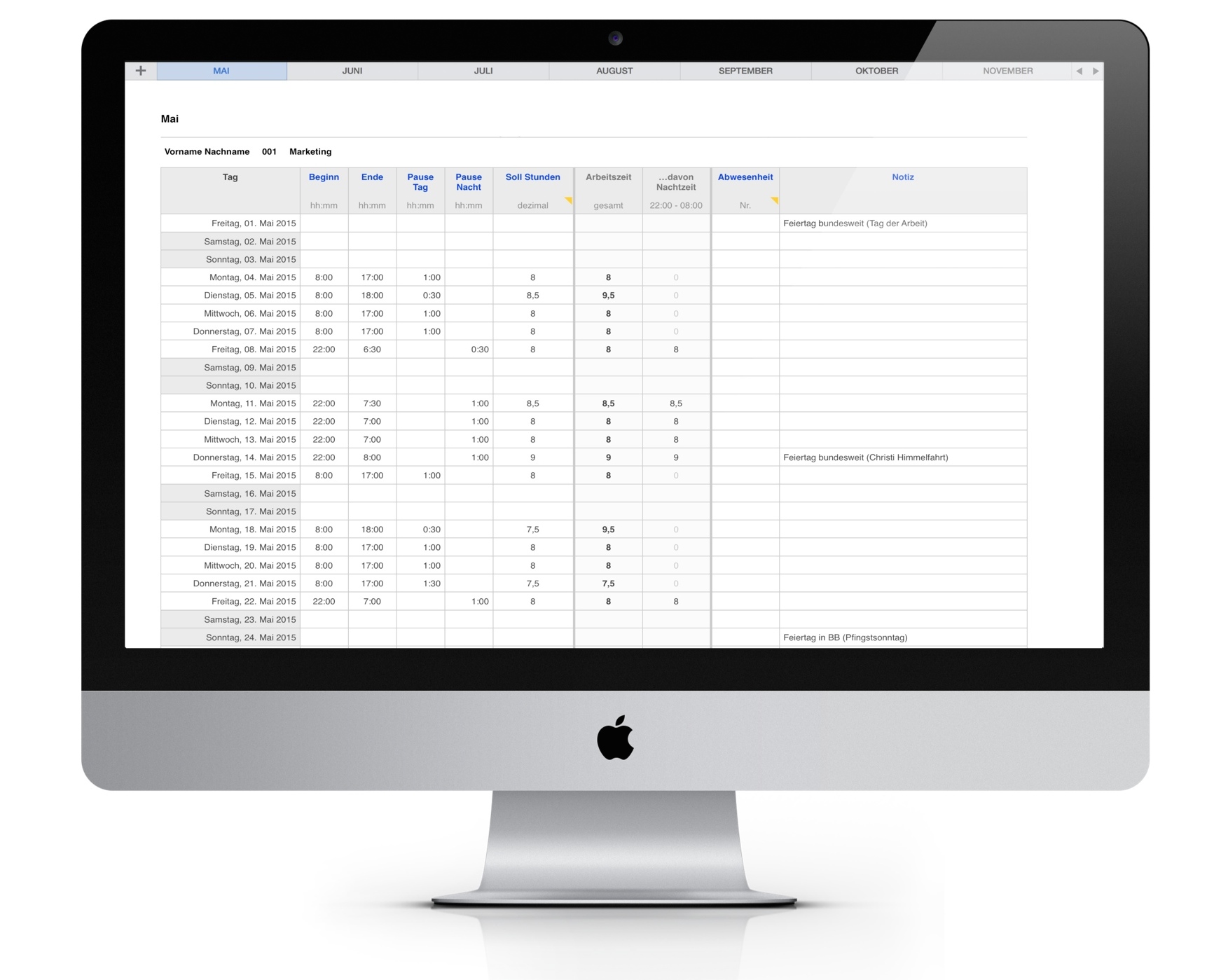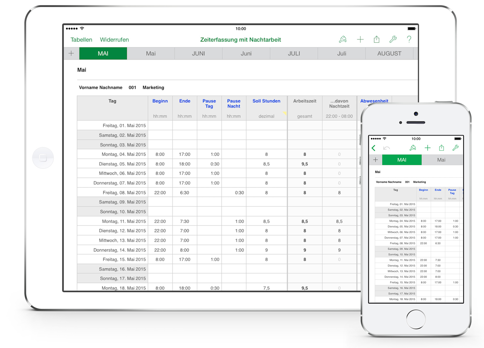 Pro Tag ist eine Zeile vorgesehen. Jeder Monat ist auf einem eigenen Blatt mit übersichtlichen Summen, der Überstundenberechnung, Nachtstundenberechnung und voreingestellter Druckansicht.