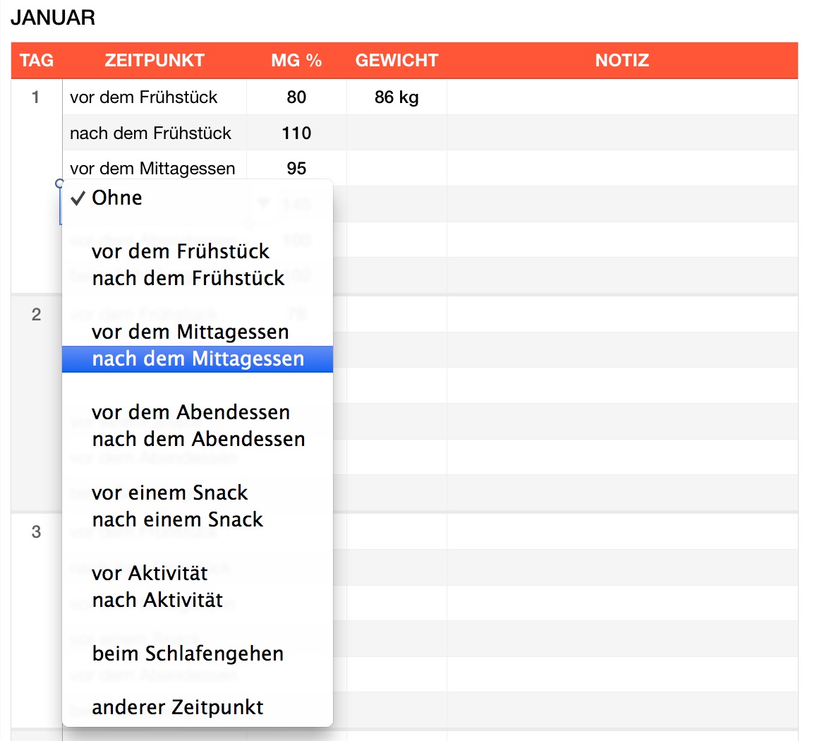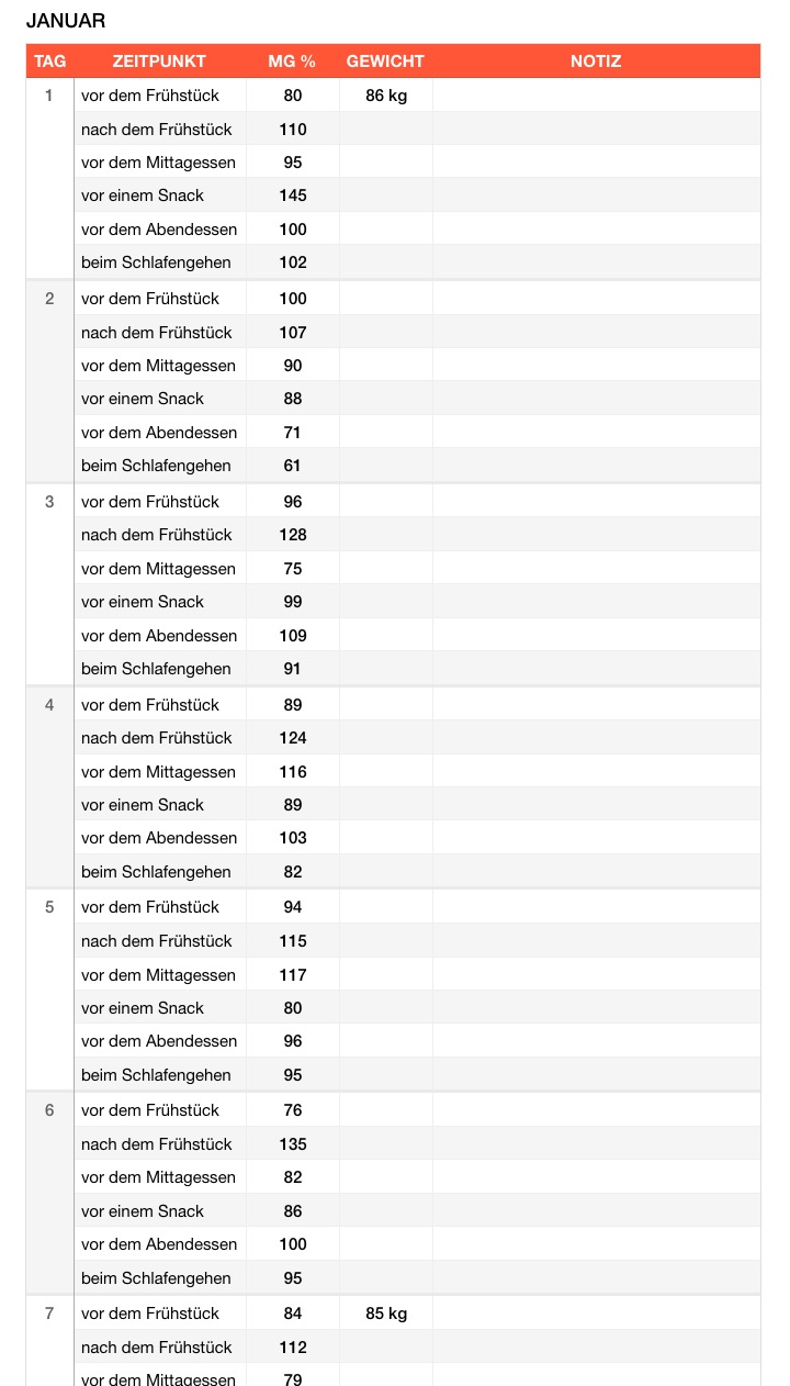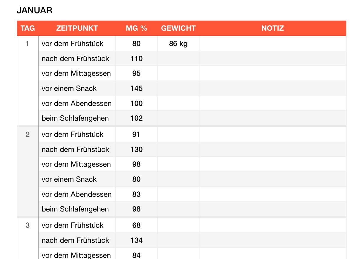 Mit dieser Vorlage erfassen Sie ganz einfach Ihre Blutzuckermessungen. Den Zeitpunkt der Messung können Sie aus dem Dropdown-Menü wählen oder selbst eingeben.