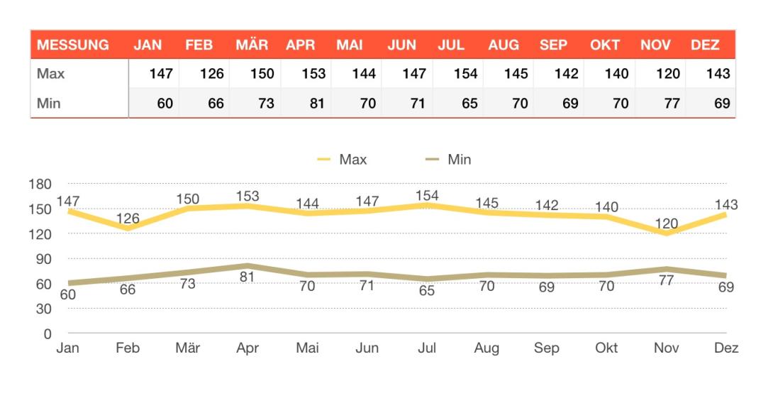 - für jeden Monat eine Tabelle mit Grafik bis zu 6 Messungen pro tag (weitere können hinzugefügt werden)