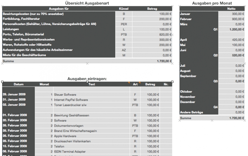 Ihre Daten werden in die einzelnen Tabellenblätter eingegeben (die Spalten sind mit einem Kommentar markiert) und auf jedem Blatt gruppiert, verrechnet und im Blatt REPORT zusammengefasst. So können Sie die Zahlen ganz einfach für das Finanzamt ablesen. Die Anwendung dieser Tabellen setzt Grundkenntnisse im Umgang mit NUMBERS und in buchhalterischer Arbeit voraus.