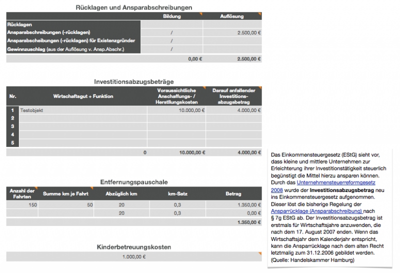 - Verrechnung der ergänzenden Angaben (Bildung und Auflösung von Rücklagen, Ansparabschreibungen, Investitionsabzugsbetrag, Entfernungspauschale, Kinderbetreuungskosten) in der Gewinnermittlung