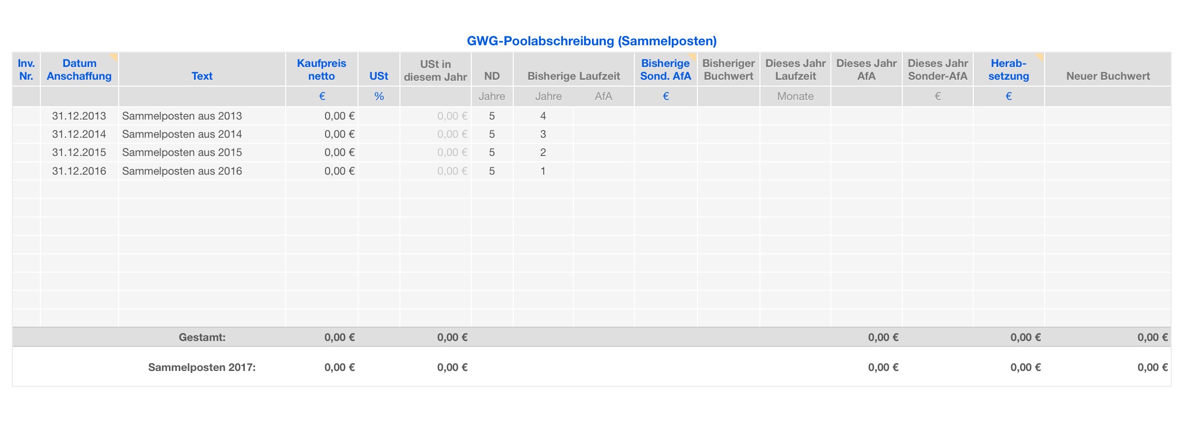 - Listen und AfA-Berechnung für GWG Sofortabschreibung, Sammelposten, bewegliche, unbewegliche und immaterielle Wirtschaftsgüter