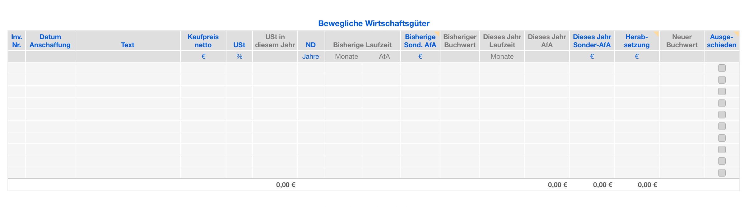 - Wirtschaftsgüterlisten mit Berechnung der Abschreibungen und Buchwerte