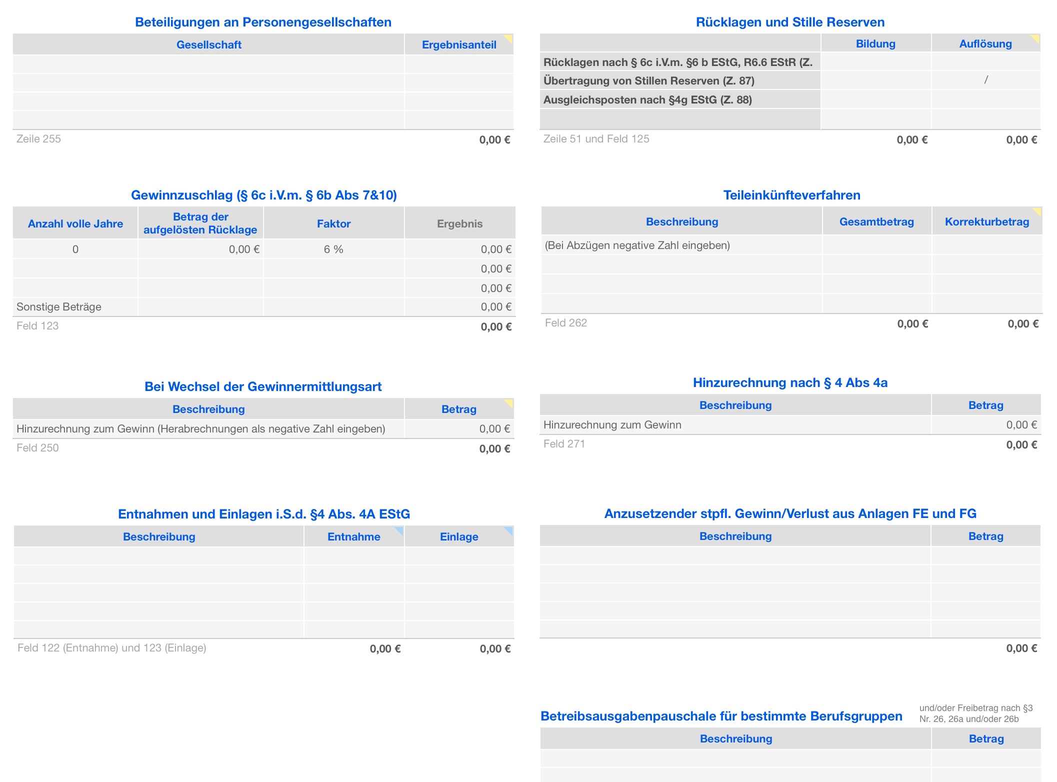 - Sonstiges: Gewinnzuschlag, Rücklagen, Beteiligungen, Teileinkünfte, Einlagen etc.