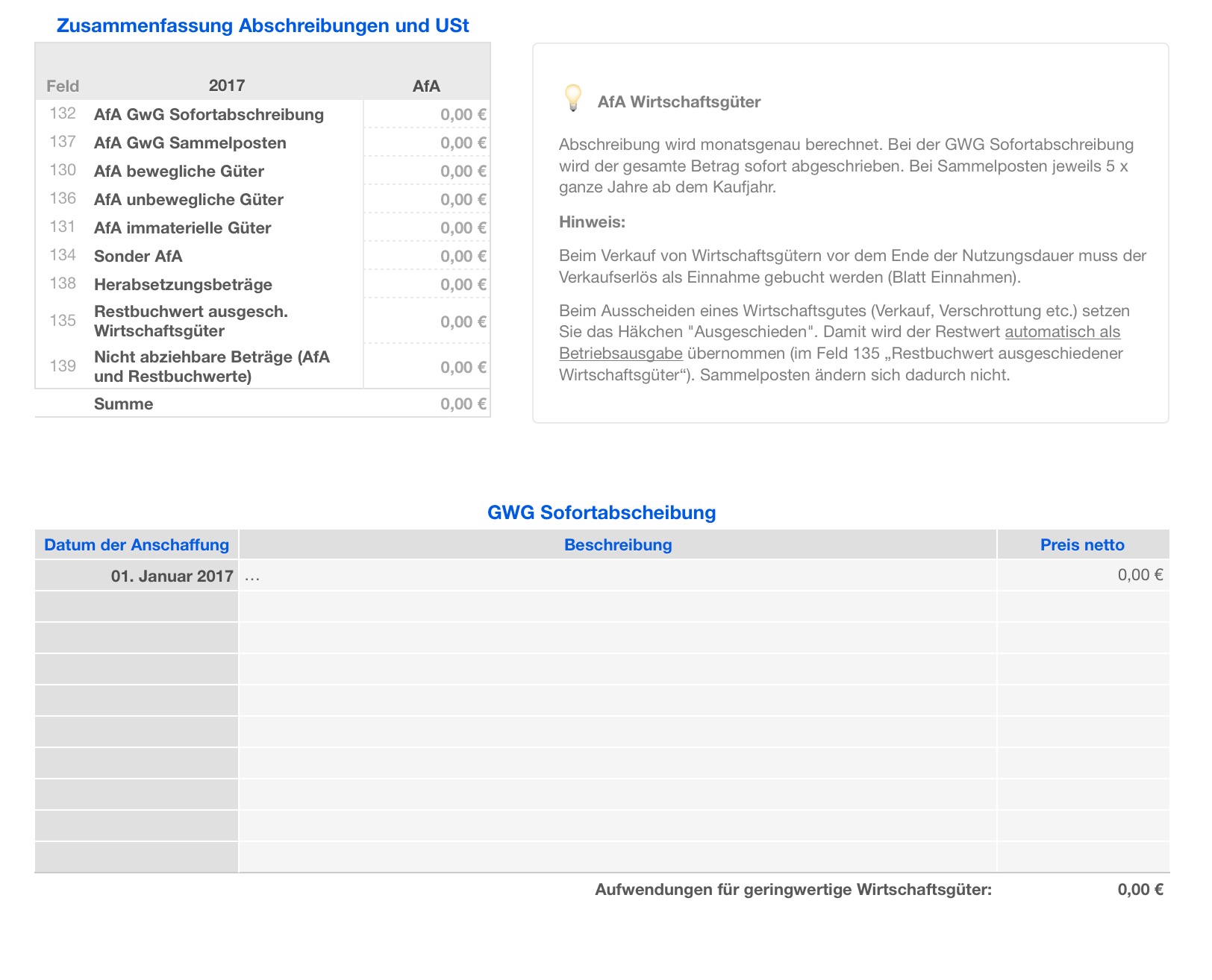 - Listen und AfA-Berechnung für GWG Sofortabschreibung und Sammelposten, bewegliche, unbewegliche und immaterielle Wirtschaftsgüter