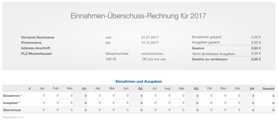 Mit der EÜR Vorlage erfassen Sie das Geschäftsjahr 2017 einfach und übersichtlich in Numbers auf dem Mac, iPad oder iPhone ohne Umsatzsteuer. Die EÜR mit USt finden Sie hier.