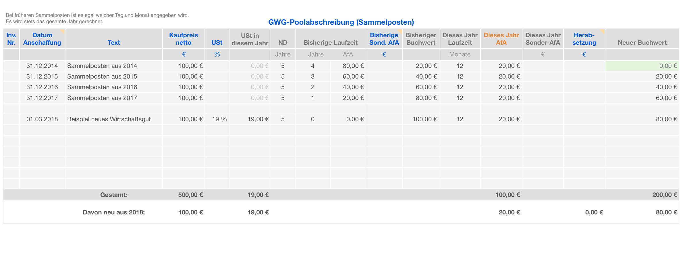 - Listen und AfA-Berechnung für GWG Sofortabschreibung, Sammelposten, bewegliche, unbewegliche und immaterielle Wirtschaftsgüter