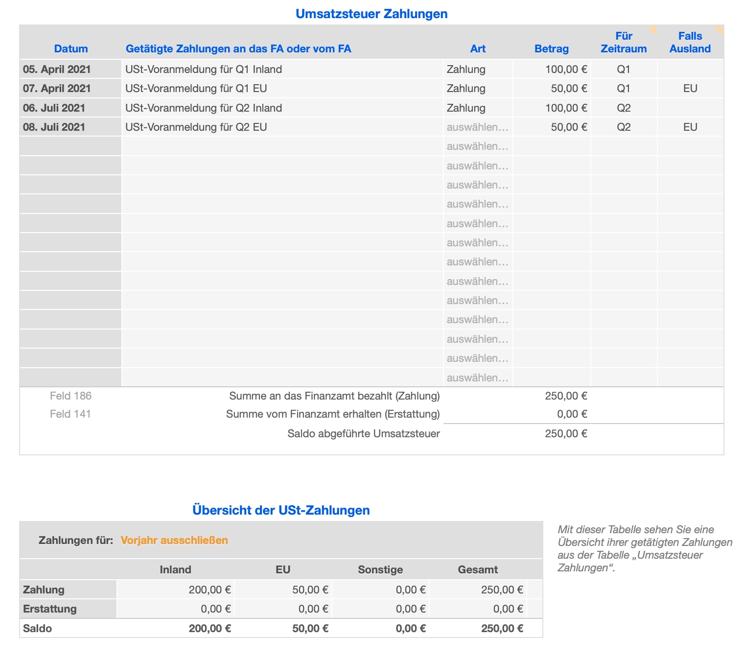 • Übersicht der tatsächlich getätigten USt-Zahlungen nach Inland, EU und Sonstiges Ausland