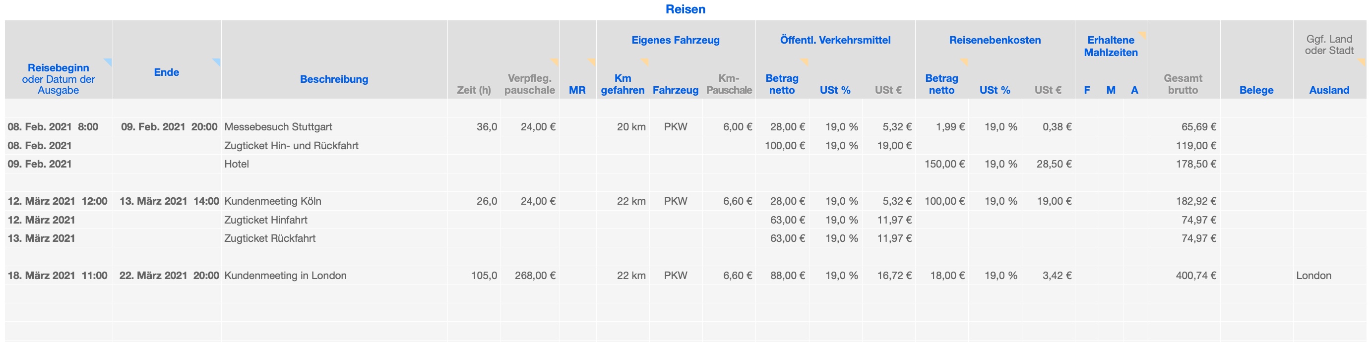 • Automatische Berechnung der Reisedauer, Fahrtkosten und Verpflegungspauschale