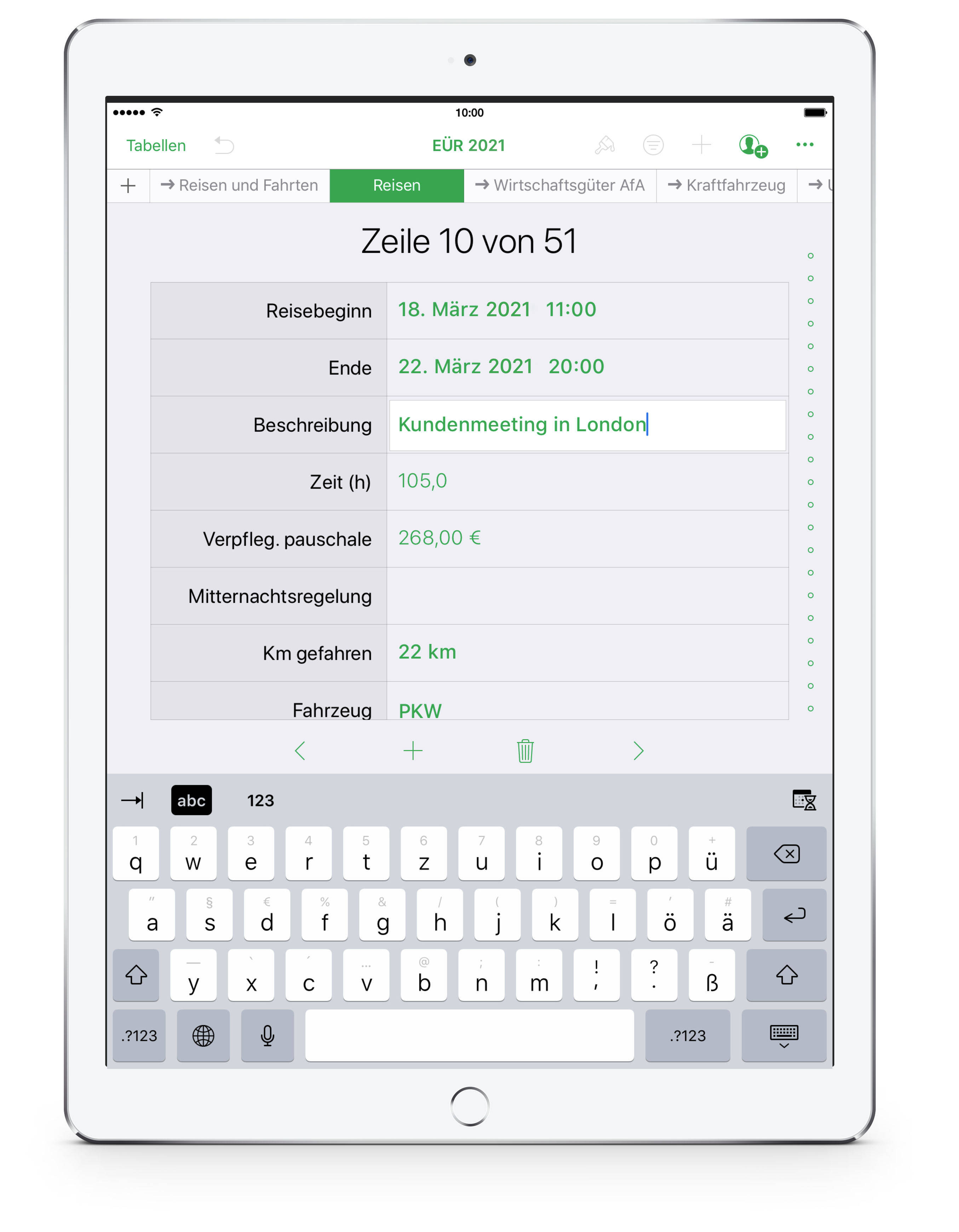 Beim Einsatz auf dem iPad und iPhone stehen zusätzliche Eingabeformulare für die Einnahmen, Ausgaben und Reisen zur Verfügung, wodurch die Eingabe auf kleineren Bildschirmen und ohne Maus und Tastatur erleichtert wird. Numbers auf dem iPhone oder iPad benötigt stets die aktuelle Version von iOS.