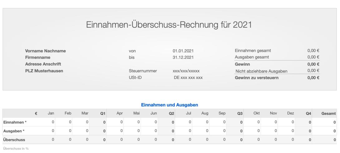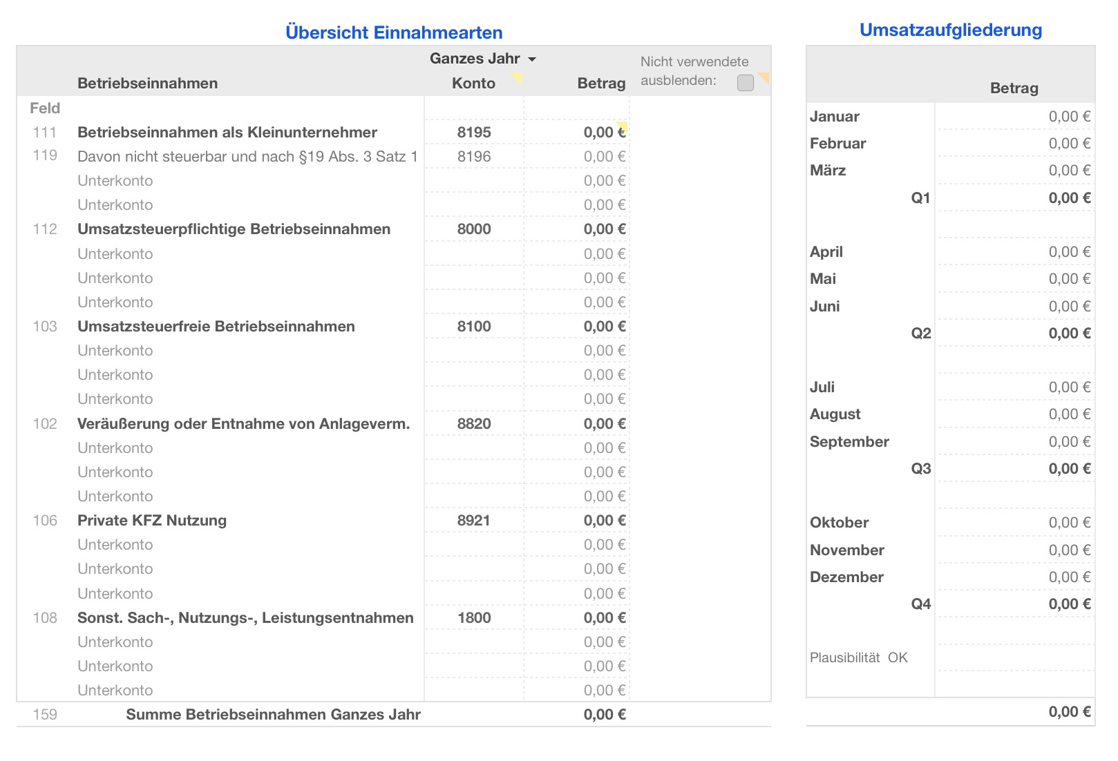 Ihre Eingaben werden für das EÜR-Formular des Finanzamts ausgewertet und in den Kategorien für das Steuerformular (*) dargestellt.