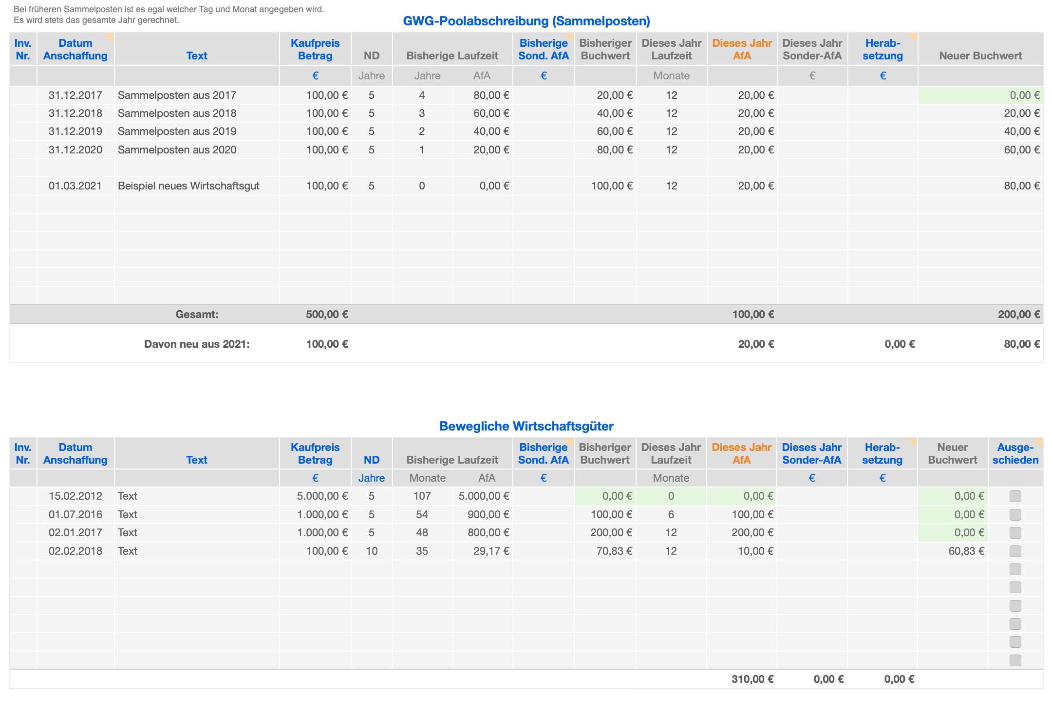 • Listen und AfA-Berechnung für GWG Sofortabschreibung und Sammelposten, bewegliche, unbewegliche und immaterielle Wirtschaftsgüter