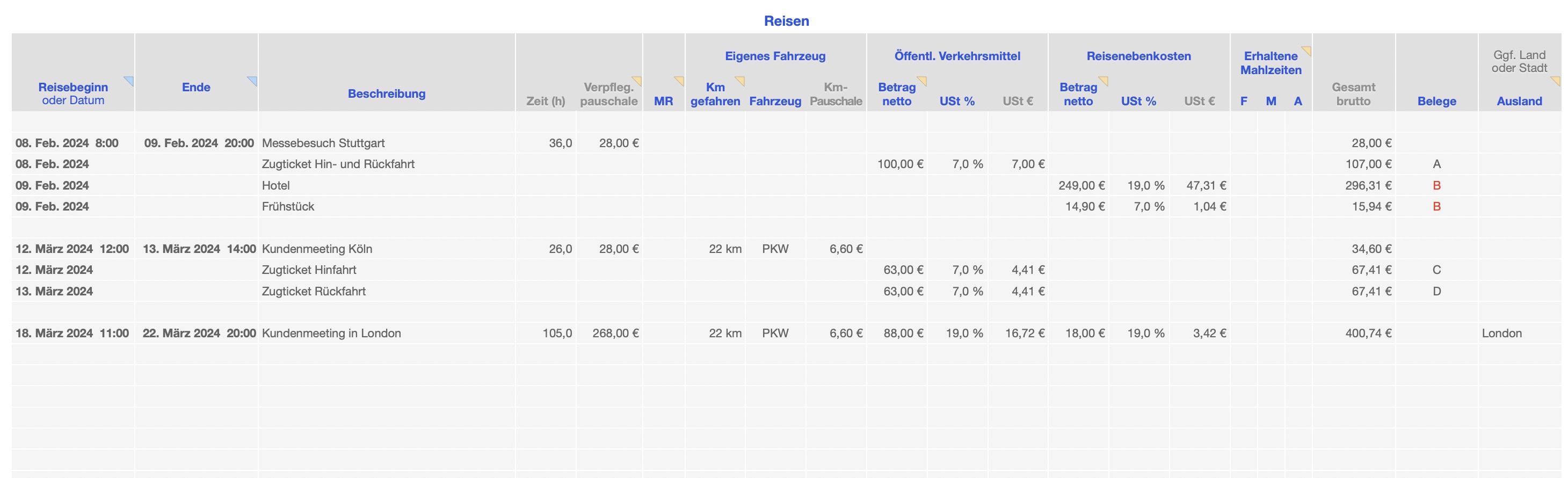 - Automatische Berechnung von Reisedauer, Fahrtkosten und Verpflegungspauschale
