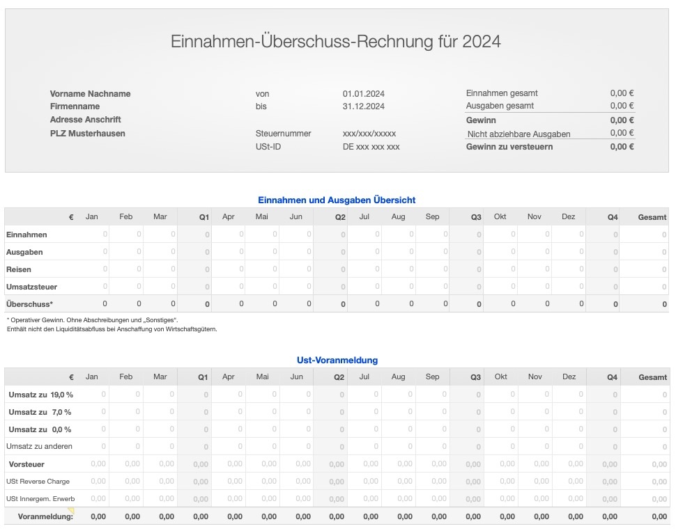 Die Vorlage ermöglicht dem Anwender, das Kalenderjahr als Geschäftsjahr zu erfassen. Die Ergebnisse erleichtern das Ablesen und Übertragen in das Formular "Anlage EÜR". Die elektronische Übermittlung an das Finanzamt kann mit dem Elster-Formular oder einer App wie "Steuererklärung" abgeschlossen werden. Die Vorlage selbst ist kein amtlicher Ausdruck und verfügt nicht über eine Online-Schnittstelle zum Finanzamt. Sie ist keine Steuer-, Rechts- oder Finanzberatung.