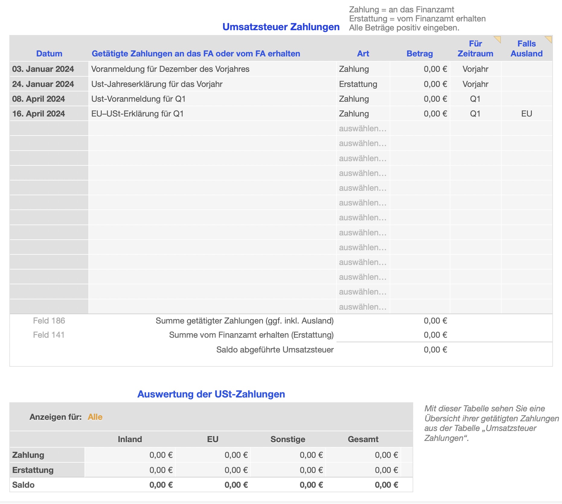 - Übersicht der tatsächlich getätigten USt-Zahlungen nach Inland, EU und Sonstiges Ausland