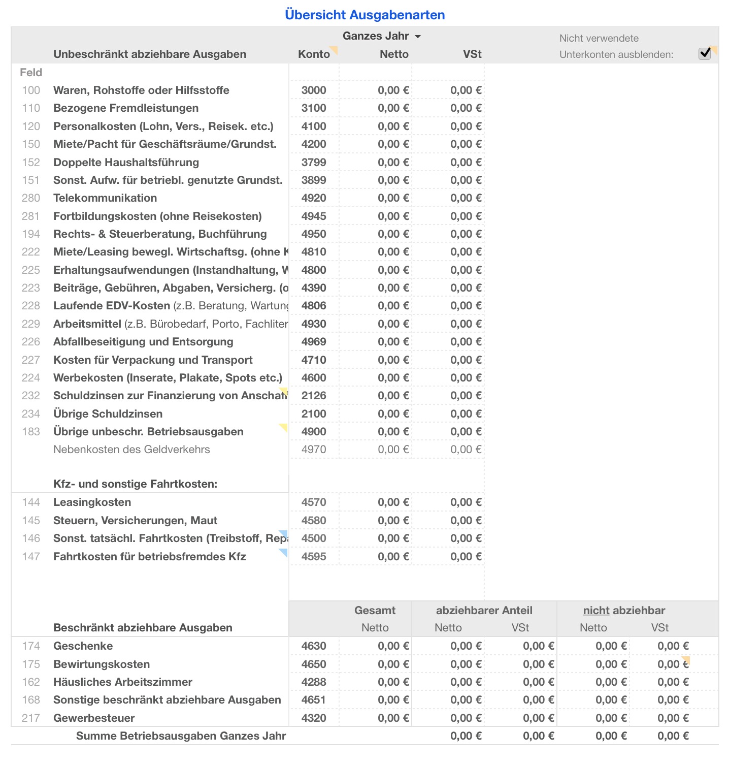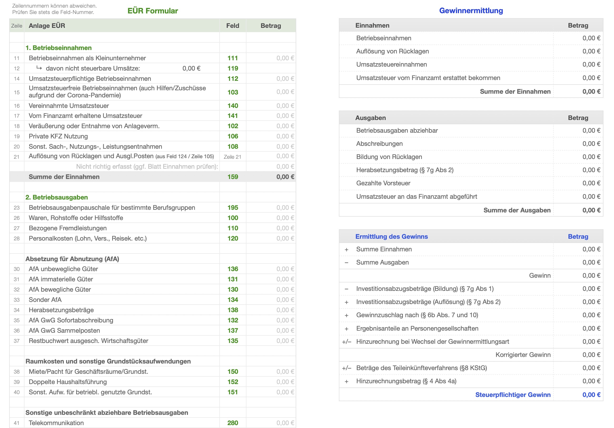 - Auswertung für die "Anlage EÜR" der Einkommensteuererklärung mit Angabe der Feldnummern zum Ausfüllen (*)