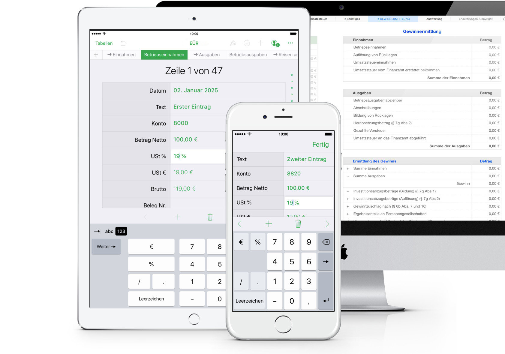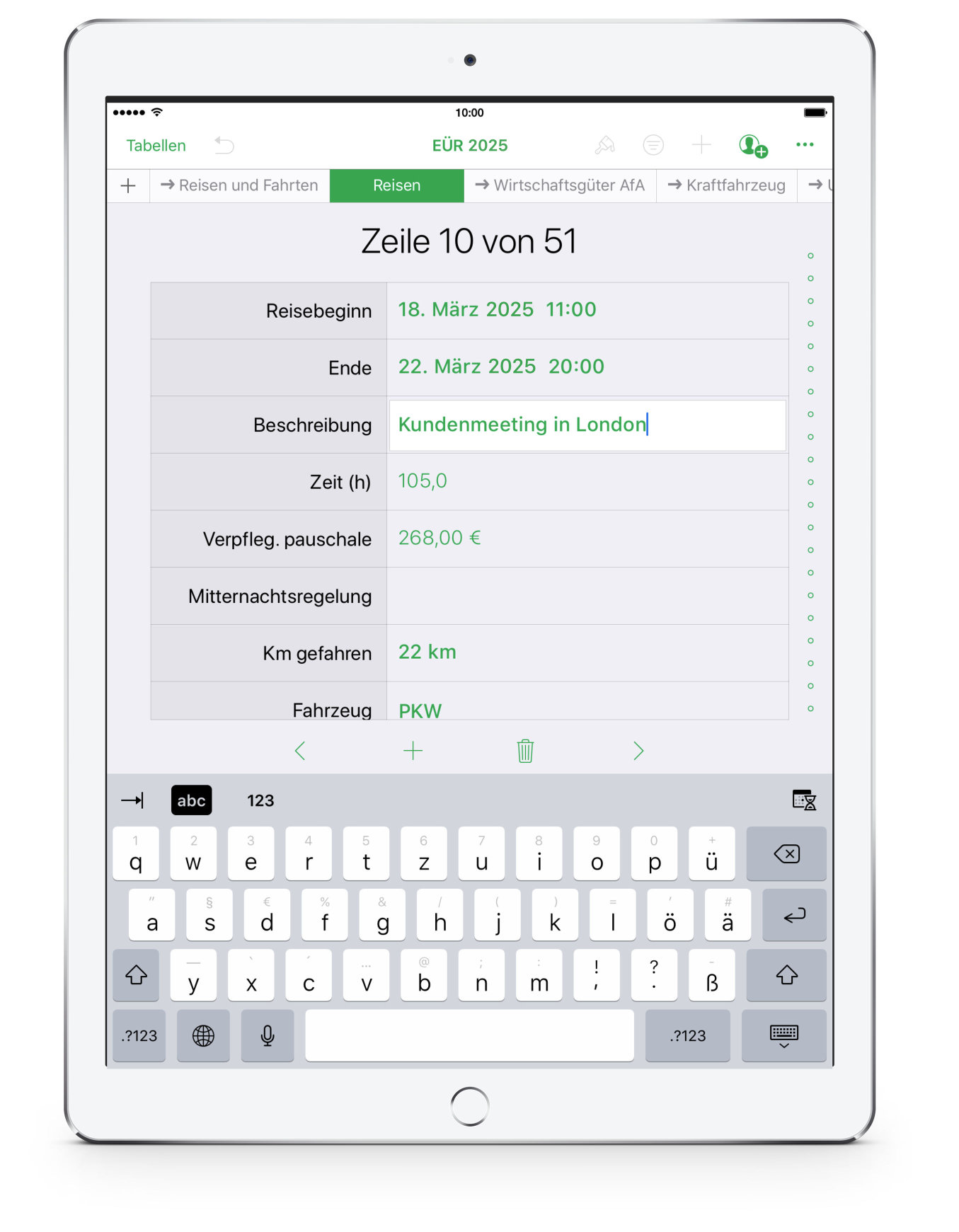Beim Einsatz auf dem iPad und iPhone stehen zusätzliche Eingabeformulare für die Einnahmen, Ausgaben und Reisen zur Verfügung, wodurch die Eingabe auf kleineren Bildschirmen und ohne Maus und Tastatur erleichtert wird. Numbers auf dem iPhone oder iPad benötigt stets die aktuelle Version von iOS.