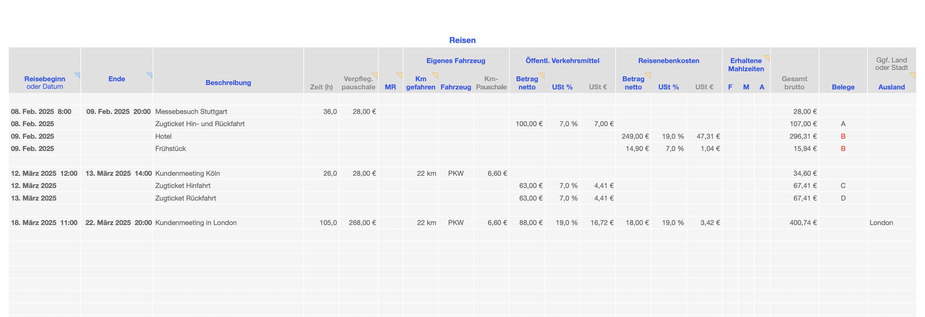 - Automatische Berechnung der Reisedauer, Fahrtkosten und Verpflegungspauschale