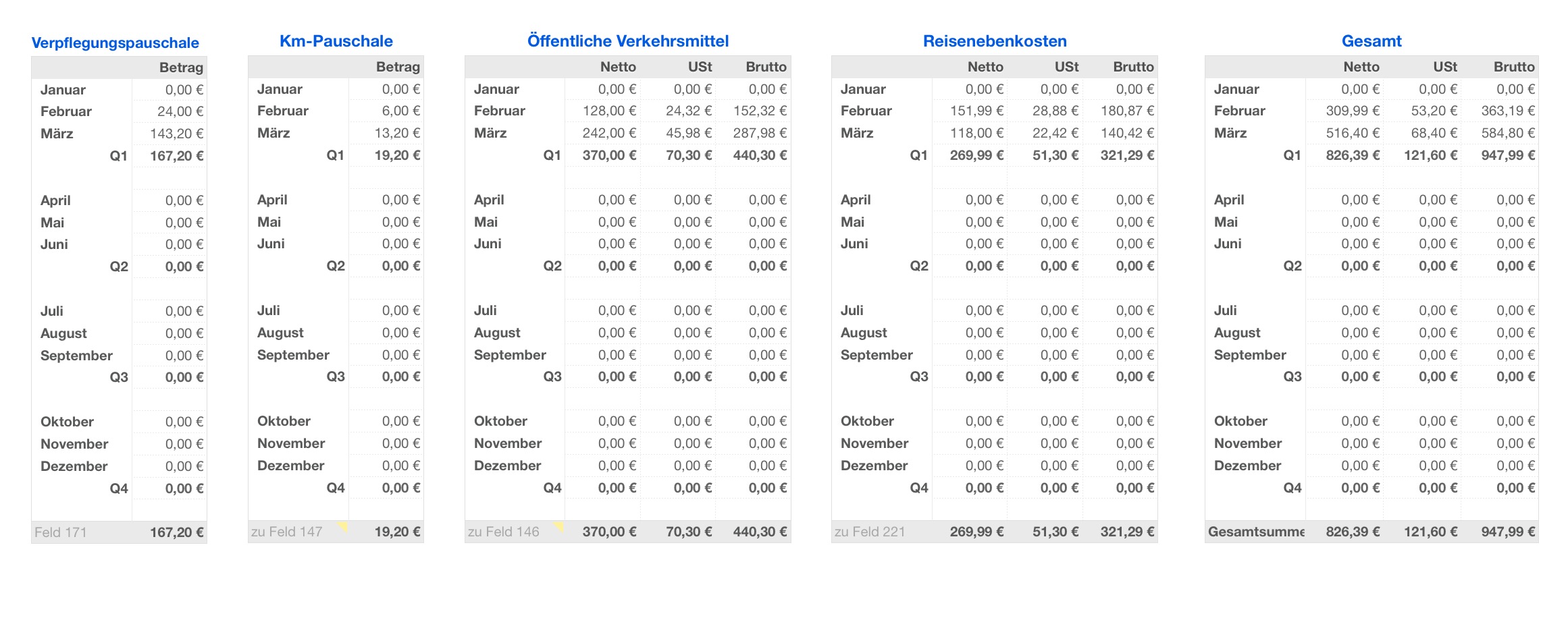 Die Vorlage bietet darüber hinaus weitere Berechnungen wie z.B. die USt-Voranmeldung, Verpflegungsmehraufwendungen, Abschreibungen, Fahrtkosten und Reisekosten. Zur genaueren Übersicht werden Zwischensummen nach Monaten, Quartalen und Steuersätzen dargestellt.