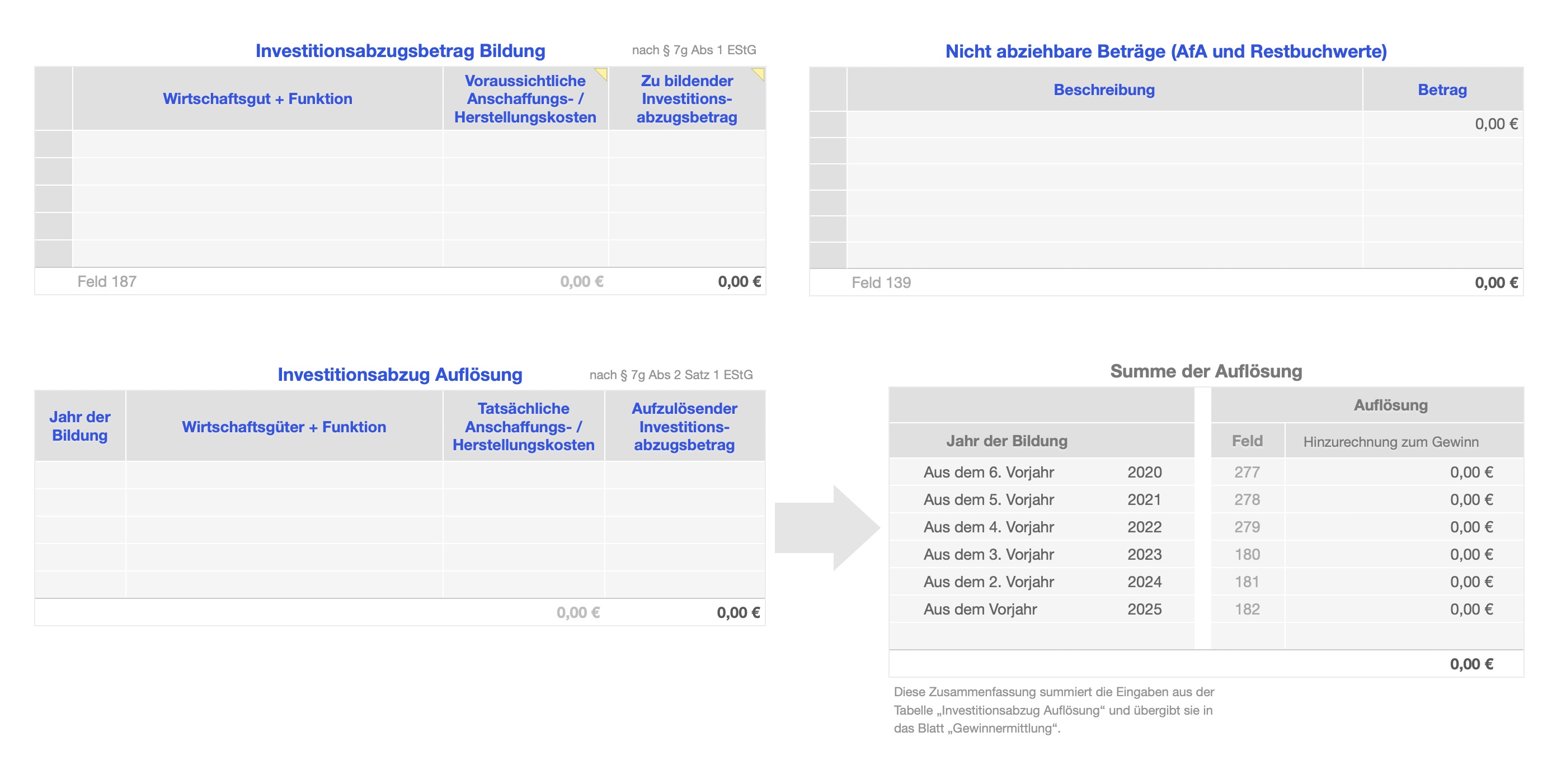 • Sonstiges: Gewinnzuschlag, Rücklagen, Beteiligungen, Teileinkünfte, Einlagen etc.